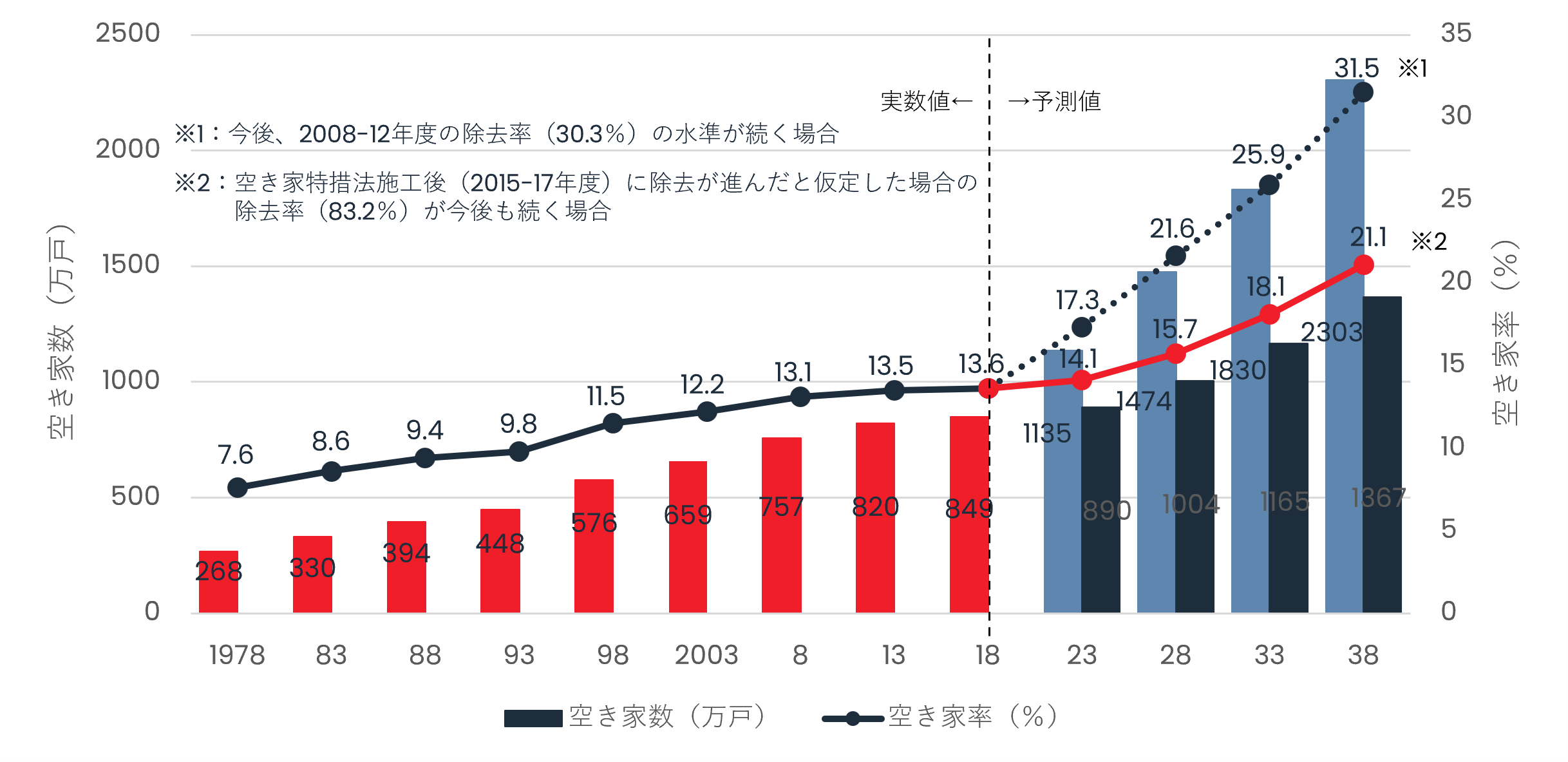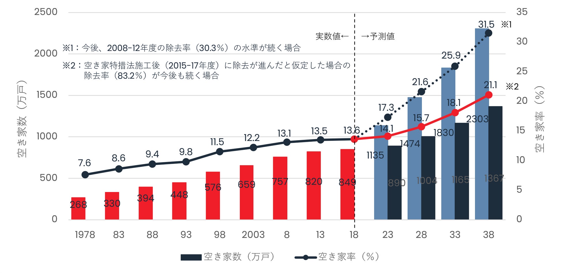 総務省統計局が2018年9月30日に発表した「平成30年住宅・土地統計調査」によると、全国の空き家は849万戸、全住宅に占める空き家率は13.6%となり、過去最高となっています。さらに、2033年に現在の2倍弱の25.1%と全国の住宅の4軒に1軒が空き家になると予測されています。2038年には31.5%(※3)になる可能性があるともいわれ、「空き家問題」として社会課題に挙げられ注目されています。