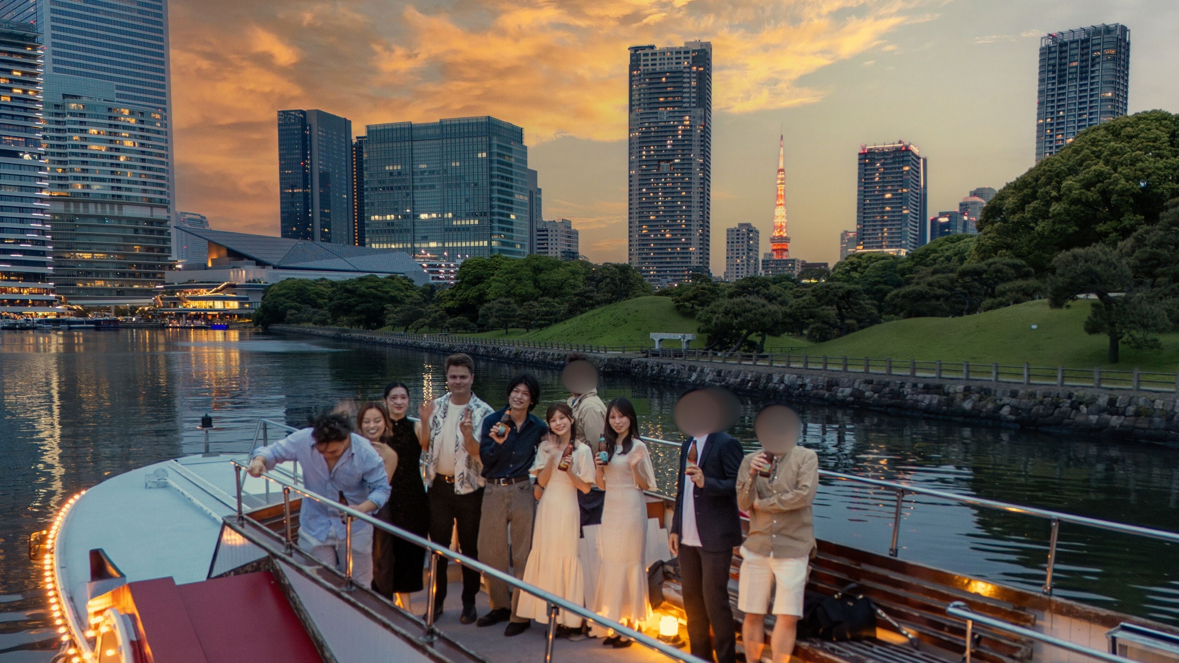 乗船時無料ビールプレゼントに加え、乗船中の姿を東京の美しい夜景とともに残せるドローンでの記念撮影もご用意。