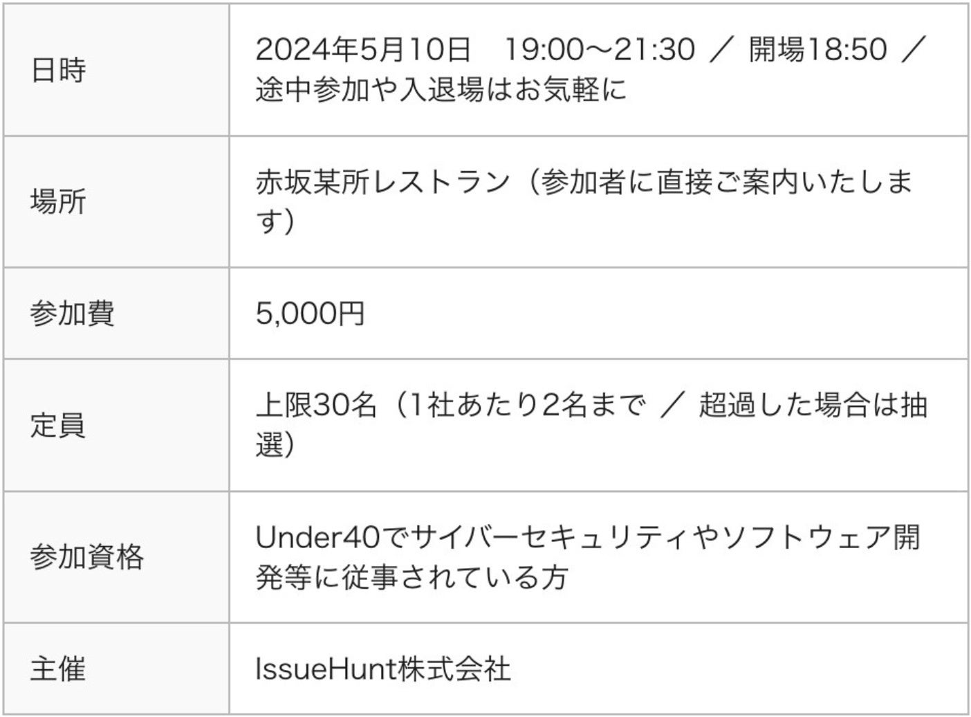 ・定員超過の場合は、プロダクトセキュリティに従事されている方、IssueHunt運営から直接ご案内を受けた方を優先的にご案内いたします