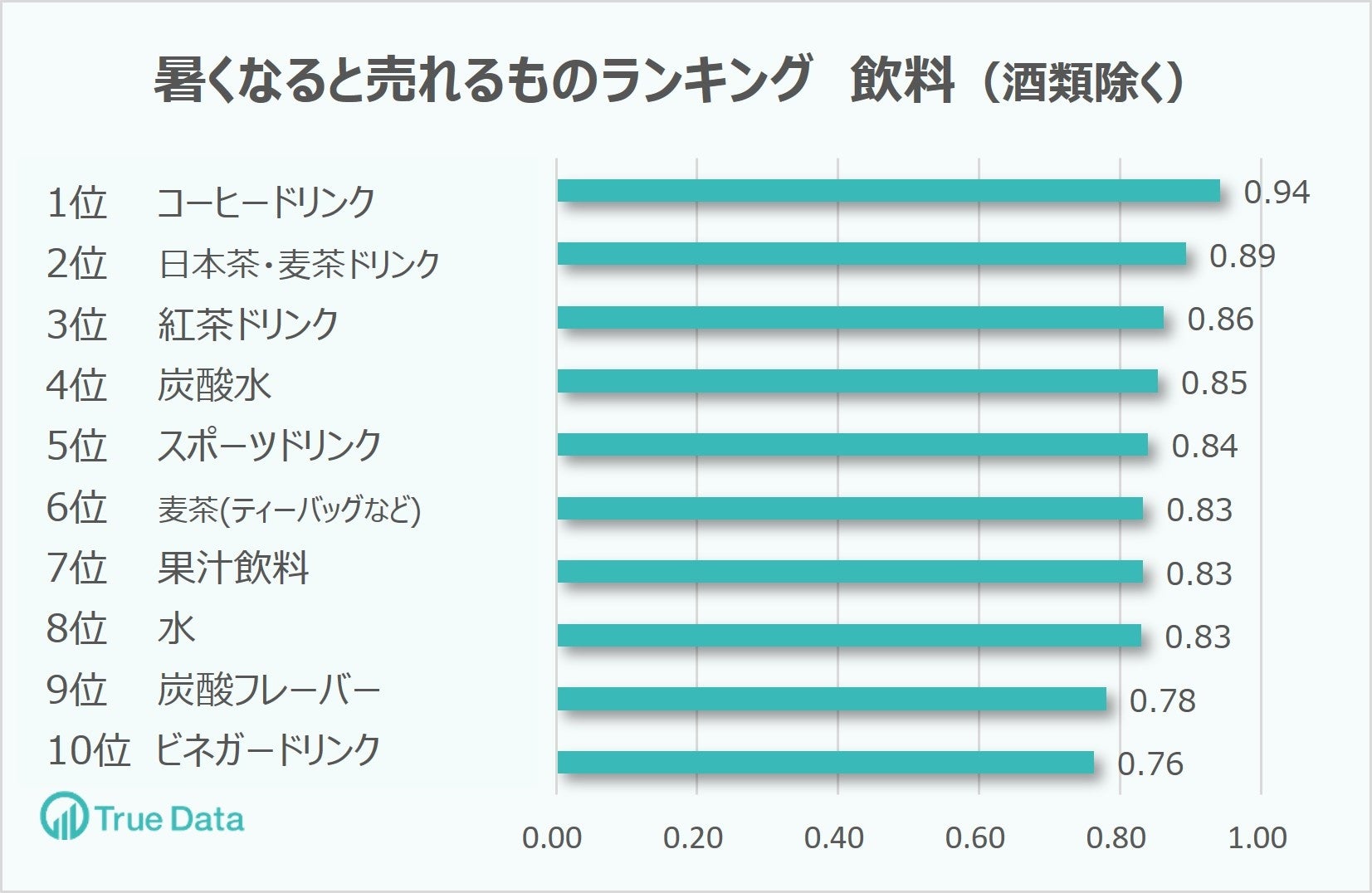 飲料(酒類除く)のランキング1位は「コーヒードリンク」で、気温との関係性を表す相関係数は0.94と非常に高い数値を示しています。「コーヒードリンク」にはペットボトルや、紙パックの商品が多く含まれおり、冷やして飲むことが多い商品のため暑さにともなって売り上げが上昇します。無糖のため水分補給に飲みやすい「日本茶・麦茶ドリンク」が2位にランクインしています。ミネラル補給ができる「麦茶(ティーバッグなど)」も6位にランクインしています。