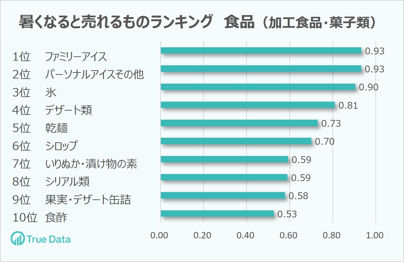 暑くなると最も売れる食品(加工食品・菓子類)は、「ファミリーアイス」でした。「ファミリーアイス」は主に複数個が箱入りで販売されている商品です。他にも単品の「パーソナルアイス」や、「氷」、「デザート類」(ゼリーやプリンなど)が上位にランクインしました。暑くなるとさっぱりとした味付けが好まれるためか、「いりぬか・漬け物の素」や「食酢」もTOP10入りしました。