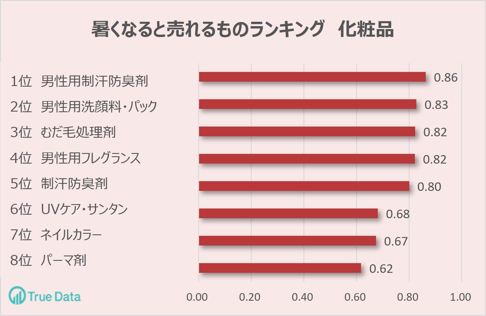 化粧品のランキング1位は「男性用制汗防臭剤」、2位は「男性用洗顔料・パック」で、男性用の商品が上位にランクインしています。男性は化粧品のストックを用意している女性と比べ、暑くなり必要になってから購入する傾向があるのかもしれません。「男性用洗顔料・パック」には洗顔シートが含まれているため、外出先で購入して使用しているシーンも多いのではないでしょうか。