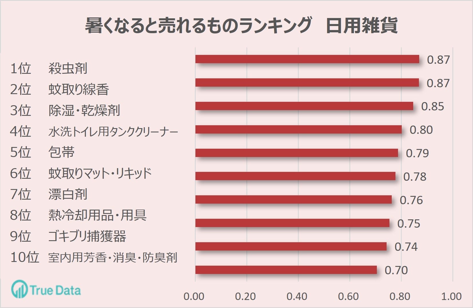 気温が上昇すると虫の動きが活発になるため、害虫対策の商品が売り上げを伸ばし1位「殺虫剤」、2位「蚊取り線香」、6位「蚊取りマット・リキッド」などがランクインしました。気温が上昇すると湿度も上昇することが多いため「除湿・乾燥剤」も高い相関係数を示しています。