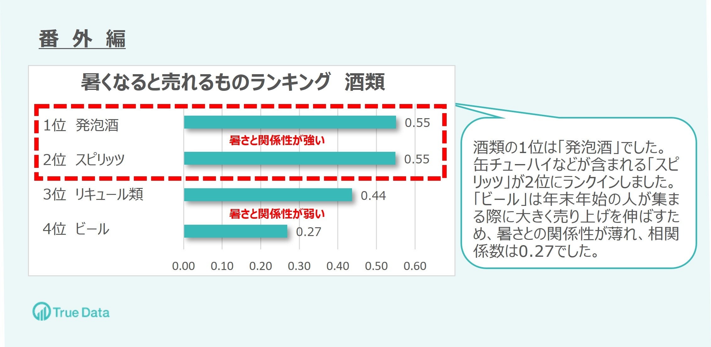 相関係数は「0.5以上」の場合、気温の上昇と関係性が強いと言われています。気温が上がれば売り上げが伸びる相関のため値が大きいほどランキング上位となります。なお、相関係数が1を超えることはありません。