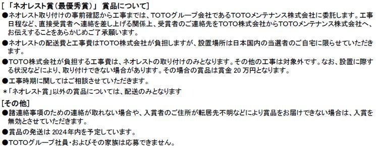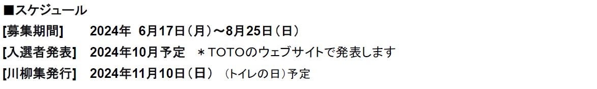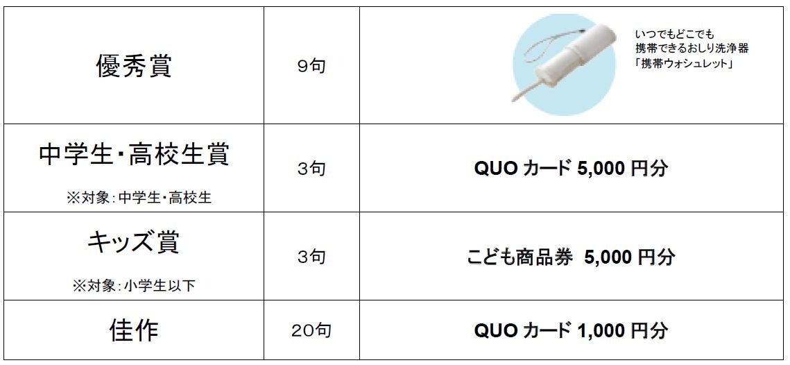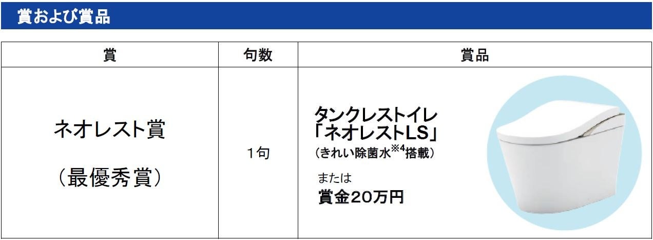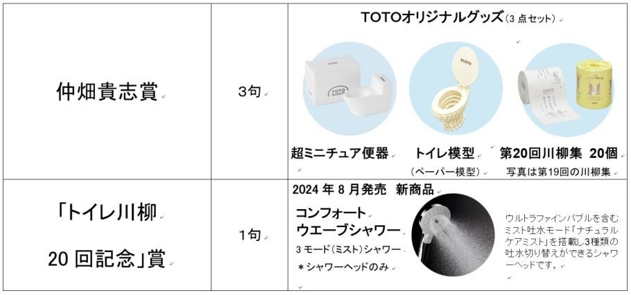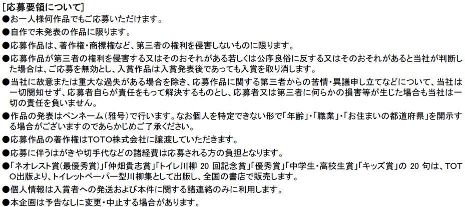 「ネオレスト賞(最優秀賞)」の他、独創的な句を選出する「仲畑貴志賞」や、小学生以下を対象とした「キッズ賞」、中学生・高校生を対象にした「中学生・高校生賞」に加え、20回目を迎える今回は「トイレ川柳20回記念賞」を設けています。皆さまの思わず笑顔になる句をお待ちしています。優秀作品※1の20句は、トイレットペーパー型川柳集『第20回トイレ川柳大賞』<希望小売価格(予定):350円[税込み]>として、2024年11月10日(日)(トイレの日※2)にTOTO出版より発行予定です。