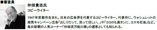 審査員は、「ウォシュレット※3」の発売当初のコピー「おしりだって洗ってほしい」で知られる仲畑貴志氏です。日本を代表するコピーライターで、毎日新聞の人気川柳コーナーの選者としても知られており、第1回目より「トイレ川柳」の審査員を務めています。