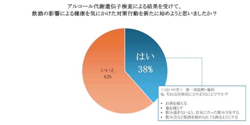 飲酒の影響による健康を気にかけた対策行動を始めようと回答した人は38%。「はい」と回答した方からは、「飲みすぎないよう、自分に合った飲み方をする」「飲み会など飲酒を勧められても断るようにする」といったコメントがありました。具体的に行動が変わった事例として、「休肝日を作る」「飲み方を気をつけるようになった」とのコメントもありました。