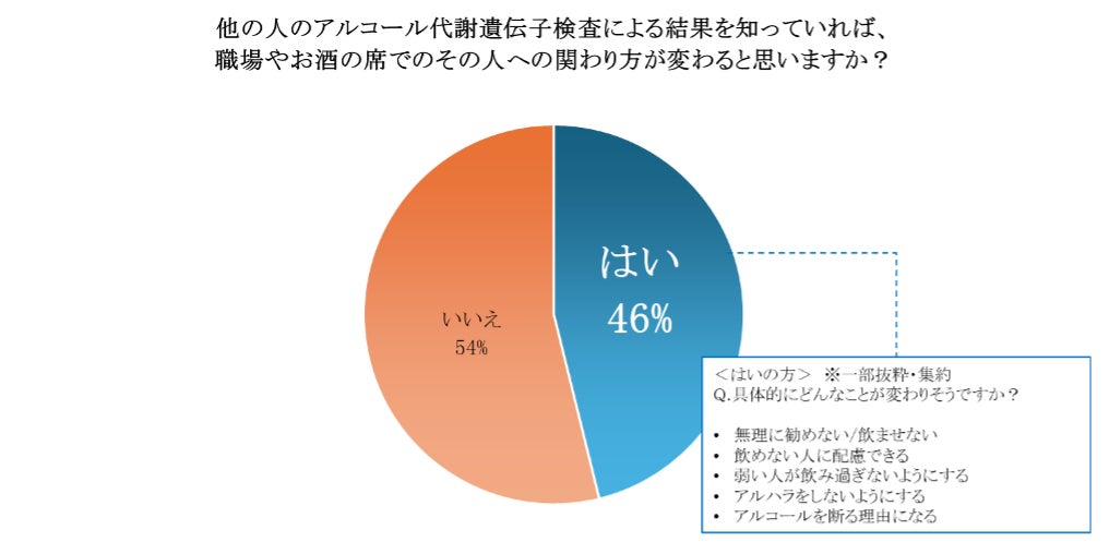 他の人のアルコール代謝遺伝子検査による結果を知っていれば、職場やお酒の席でその人への関わり方が変わると思うと回答した人は46%。「はい」と回答した方からは、「無理に勧めない/飲ませない」「弱い人が飲みすぎないようにする」「アルハラをしないようにする」といったコメントがありました。