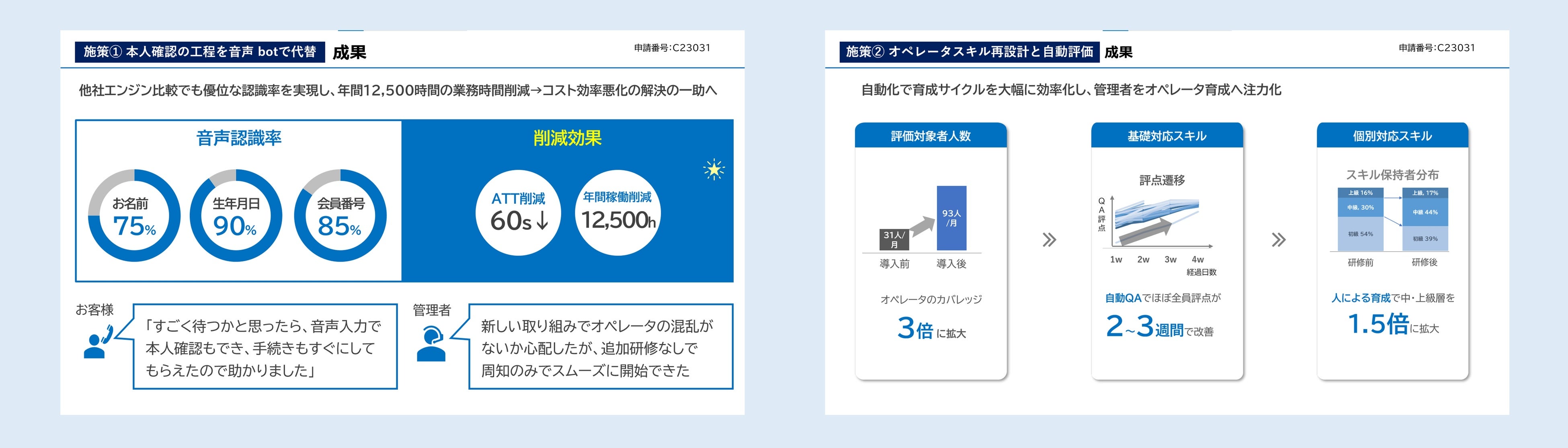 活動内容 :学びの多様化と有人窓口の高難度化を受け1件あたりの通話時間が伸長。加えて繁忙時期の育成時間不足による応対品質担保の課題解決に向け、音声認識技術を用いた事例を発表。通話時間短縮に向けた音声botの活用と、品質担保に向けたオペレータースキルの再設計と自動評価の仕組み化を、どのようにチューニングしながら進めたかを具体的に披露。CX向上とコスト最適化への先進事例として、音声認識技術の現時点での最適解と今後の可能性を示した。