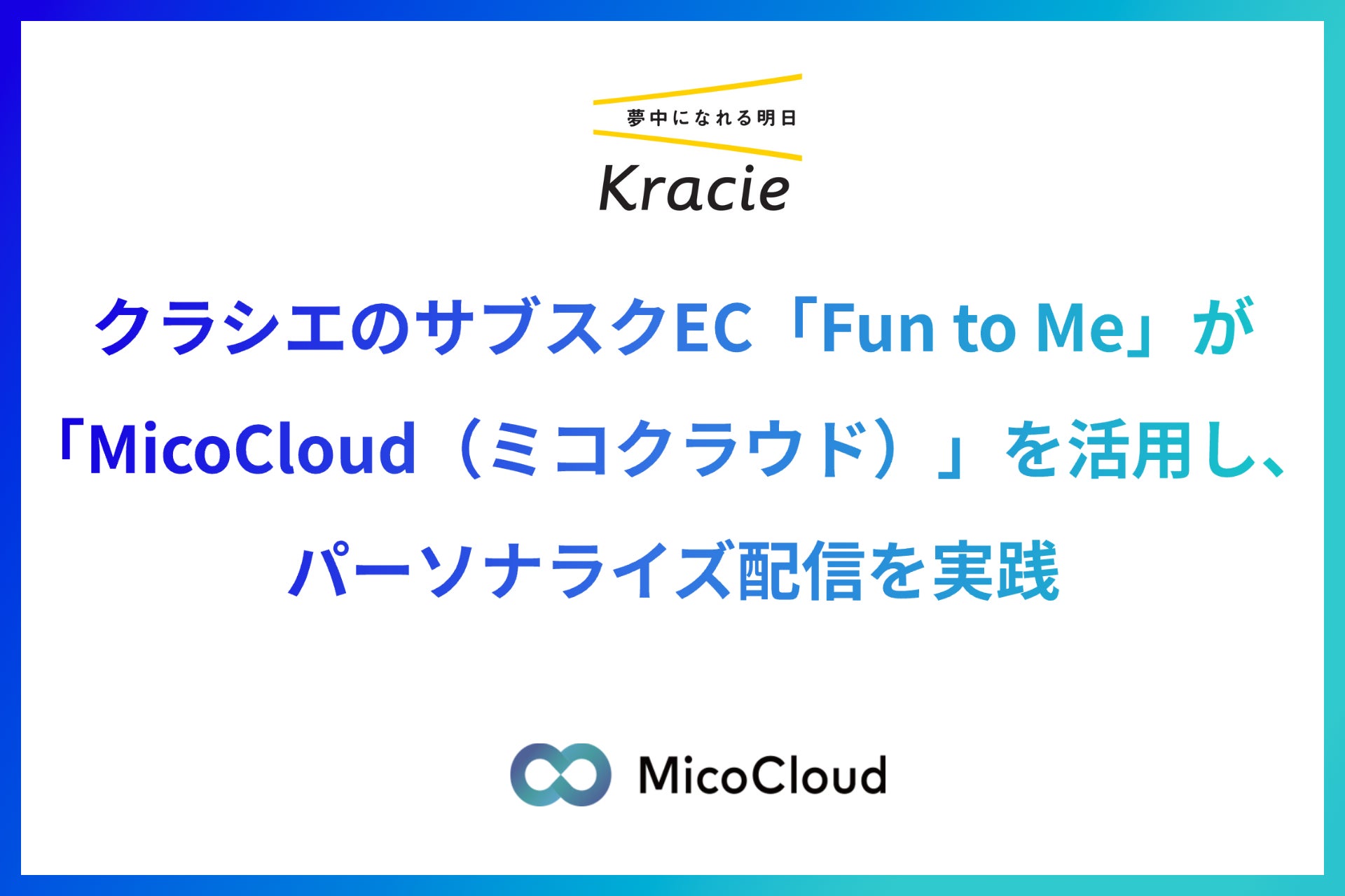 Micoworks株式会社(本社:大阪市北区、代表取締役社長:山田 修)は、クラシエ株式会社(本社:東京都港区、代表取締役 社長執行役員:草柳 徹哉)のサブスク型EC事業「Fun to Me(ファントゥーミー)」にLINEマーケティングプラットフォーム「MicoCloud(ミコクラウド)」が導入されたことを発表いたします。