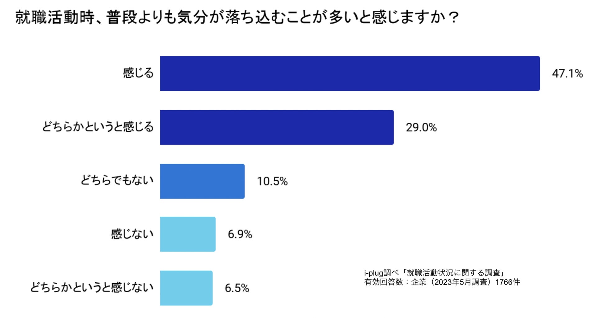 実際にi-plugが行った【2024卒対象】就職活動状況に関するアンケートによると、就職活動時、「普段より気分が落ち込むことが多い」と感じた就活生は、47.1%と約2人に1人の割合となりました。さらに、「どちらかというと気分が落ち込んでいると感じる」という回答も含めると76.1%となり、就活生の4分の3以上が就職活動によって、ネガティブな気持ちになっていることが分かりました。