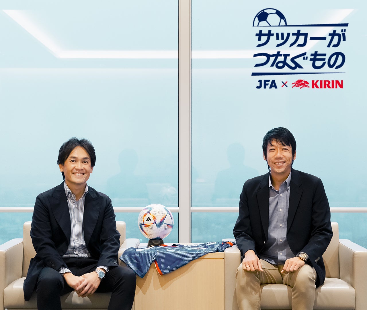 JFA 理事(会長補佐、国際委員長)の宮本恒靖さんとキリンホールディングスブランド戦略部長今村恵三さん