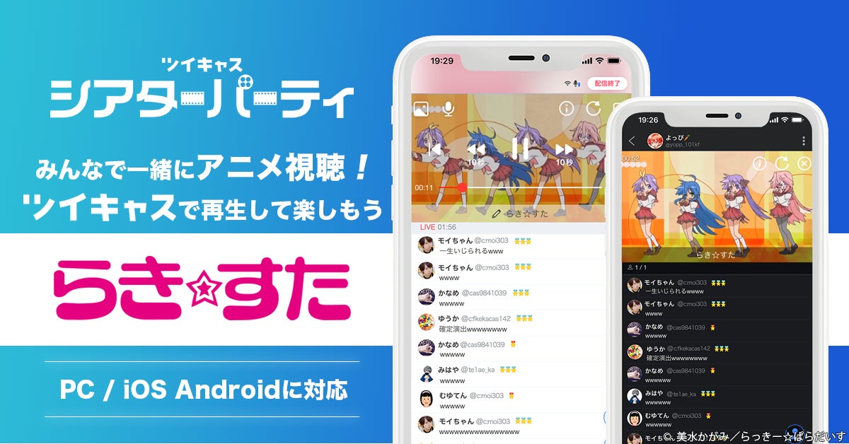 ツイキャス配信中に、シアターパーティでコンテンツを選択すると、視聴者と一緒にアニメ映像をお楽しみいただけます。