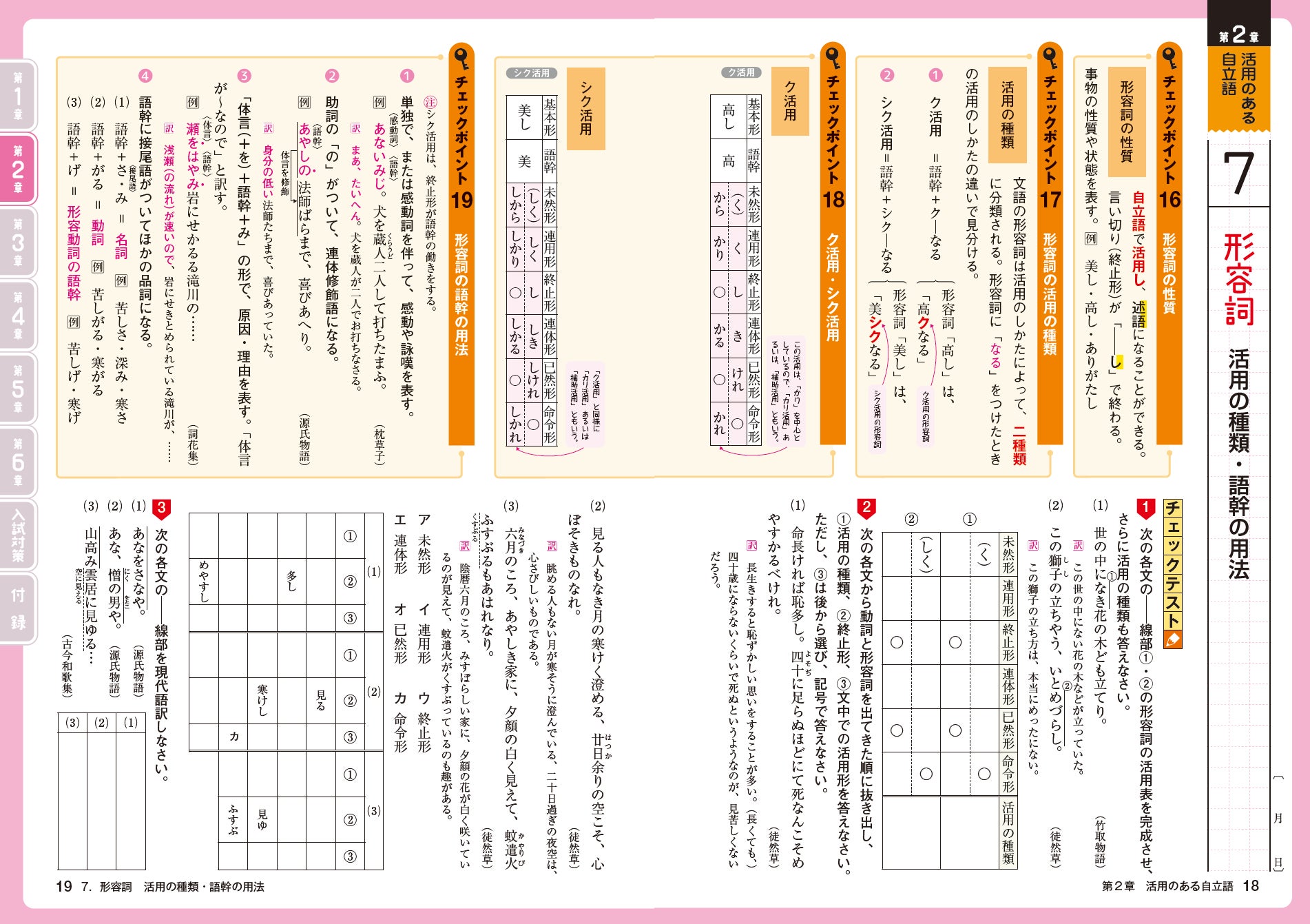 ●古典文法/上段で要点をインプット、下段のアウトプットで知識を確認。実力テストで習熟度をチェック