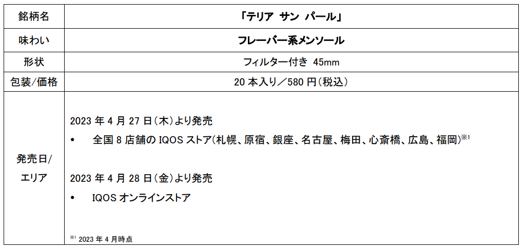 フィリップ モリス ジャパン合同会社(本社:東京都千代田区、社長:シェリー・ゴー、以下「PMJ」)は、加熱式たばこ IQOS ILUMA(イルマ)専用たばこスティック「TEREA(テリア)」から、カプセル搭載製品「テリア サン パール」を、2023年4月27日(木)より、全国8店舗のIQOSストア※およびIQOSオンラインストアにて発売いたします。