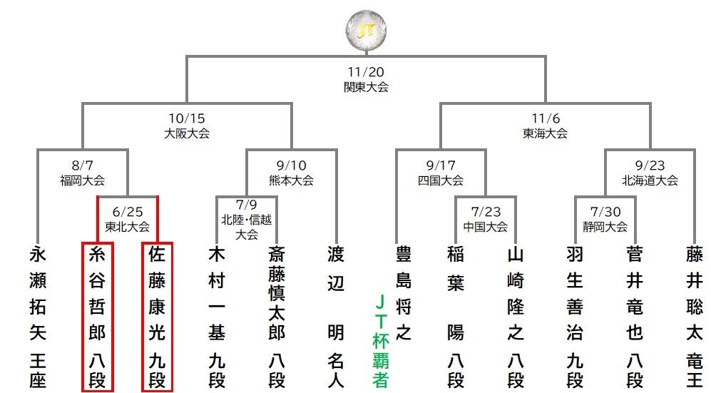 両者の対戦は過去11局で、糸谷八段の8勝3敗。佐藤九段は、「名人に定跡なし」を地で行く独特の力強い指し回しが特徴。戦型はオールラウンドに指しこなすが、最近では棒銀ではなく「暴銀」と呼ばれるような驚愕の手順を見せることもある。対する糸谷八段は、早見え早指し。居飛車党で角換わりを得意とするが、形にこだわらない奔放な一面があり、道なき道を行くような力戦はむしろ望むところである。糸谷八段は、早指し得意のイメージがあるが「JT杯」では過去4回出場で2勝4敗と本来の実力が発揮されているとは言い難い。それに対し佐藤九段は24回目の出場で、優勝2回、準優勝1回の実績を誇る。「JT杯」の舞台においての対戦は今回が初となる。どちらが序盤でペースをつかむのか、戦型の行方を含めて注目である。