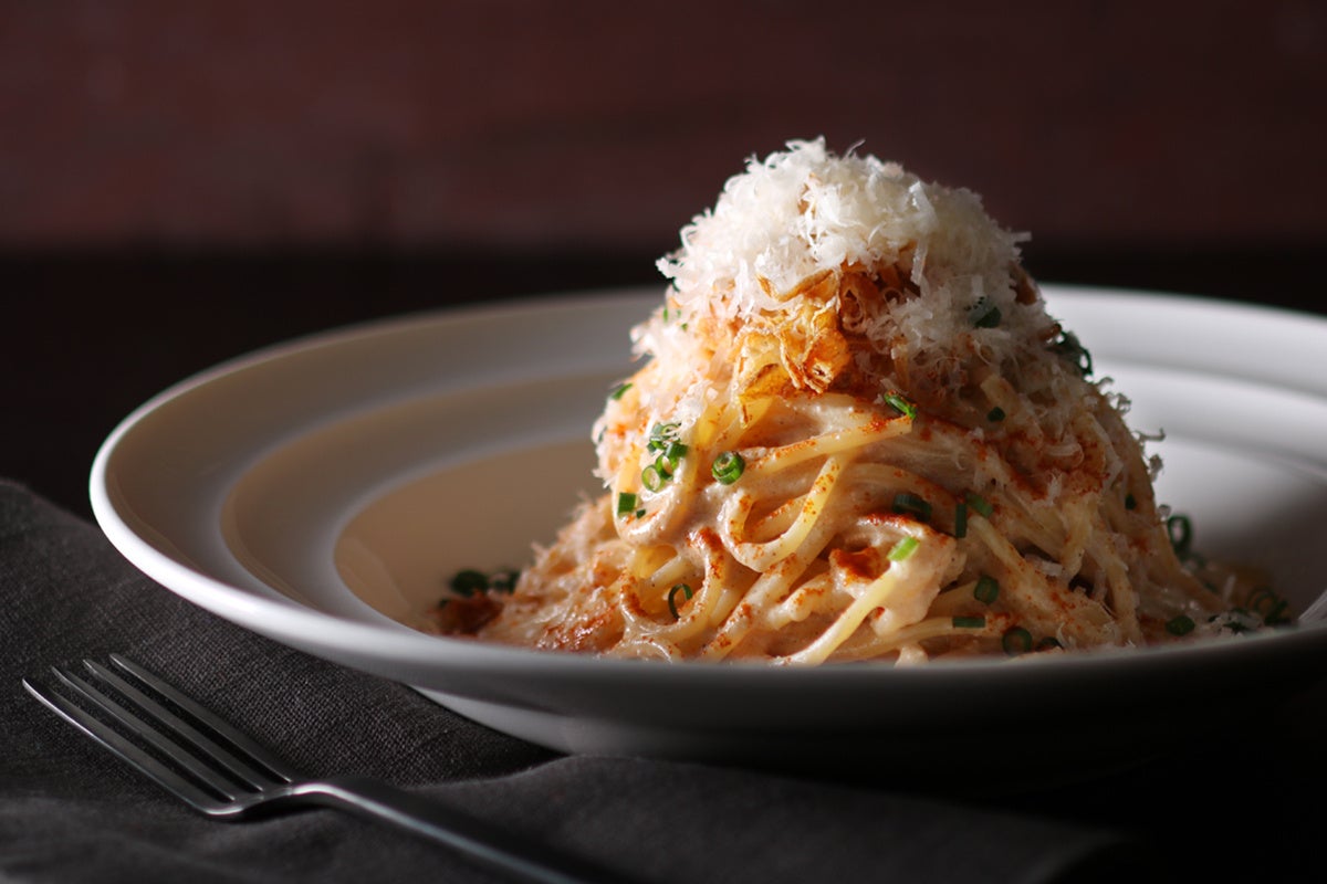 ピエトロ創業の地・福岡県の博多名物“辛子明太子”とカルボナーラをあわせた新感覚のパスタです。辛子明太子の粒感とピリッとした辛味、クリーミーなカルボナーラソースの組み合わせがクセになります。ふわふわに削ったパルミジャーノチーズをトッピング。