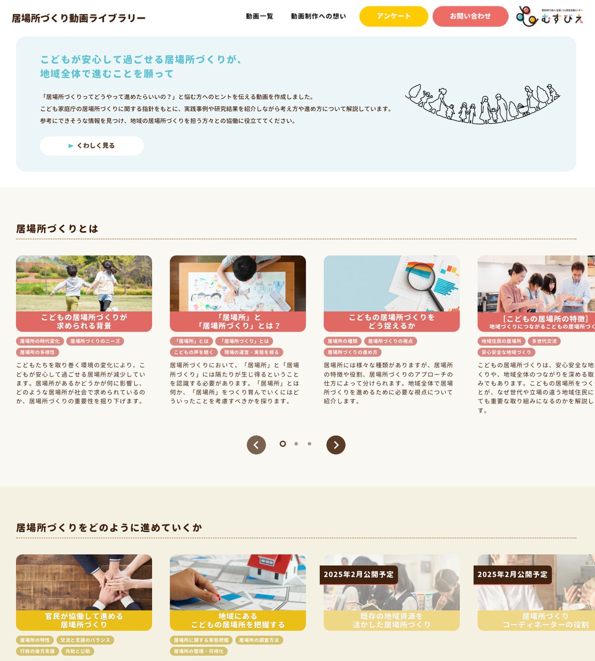 この度、本プロジェクトの取り組みとして、地域の居場所づくりについて説明した動画とそれらの動画をまとめた特設サイト むすびえ「居場所づくり動画ライブラリー」を作成しました。