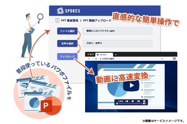 資料動画化サービス「SPOKES(スポークス)」は、パワーポイントファイルをアップロードするだけで撮影・録音なしに誰でも簡単にインタラクティブ動画が作成可能なクラウドサービスです。