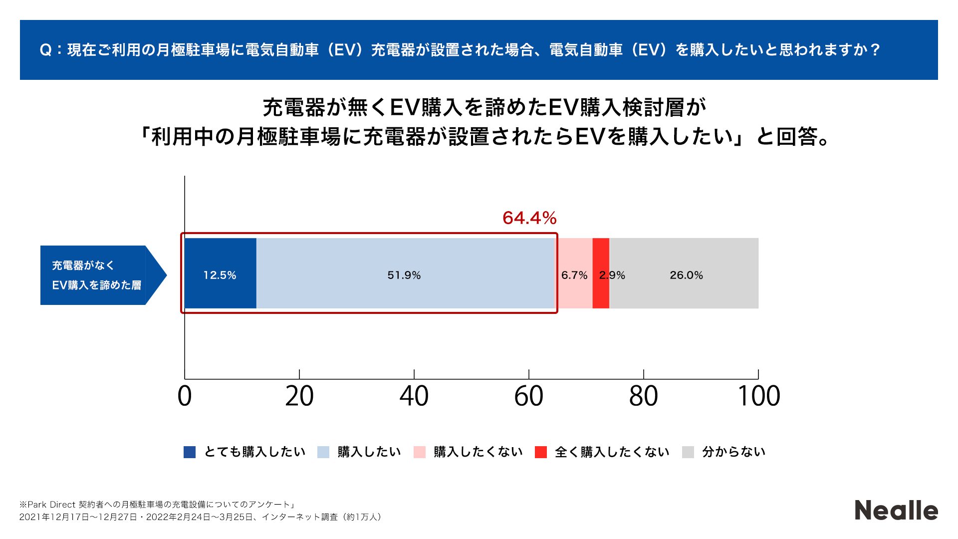 ①充電設備が無くEV購入を諦めたEV購入検討層の64.4%が「利用中の月極駐車場に充電器が設置されたらEVを購入したい」と回答。