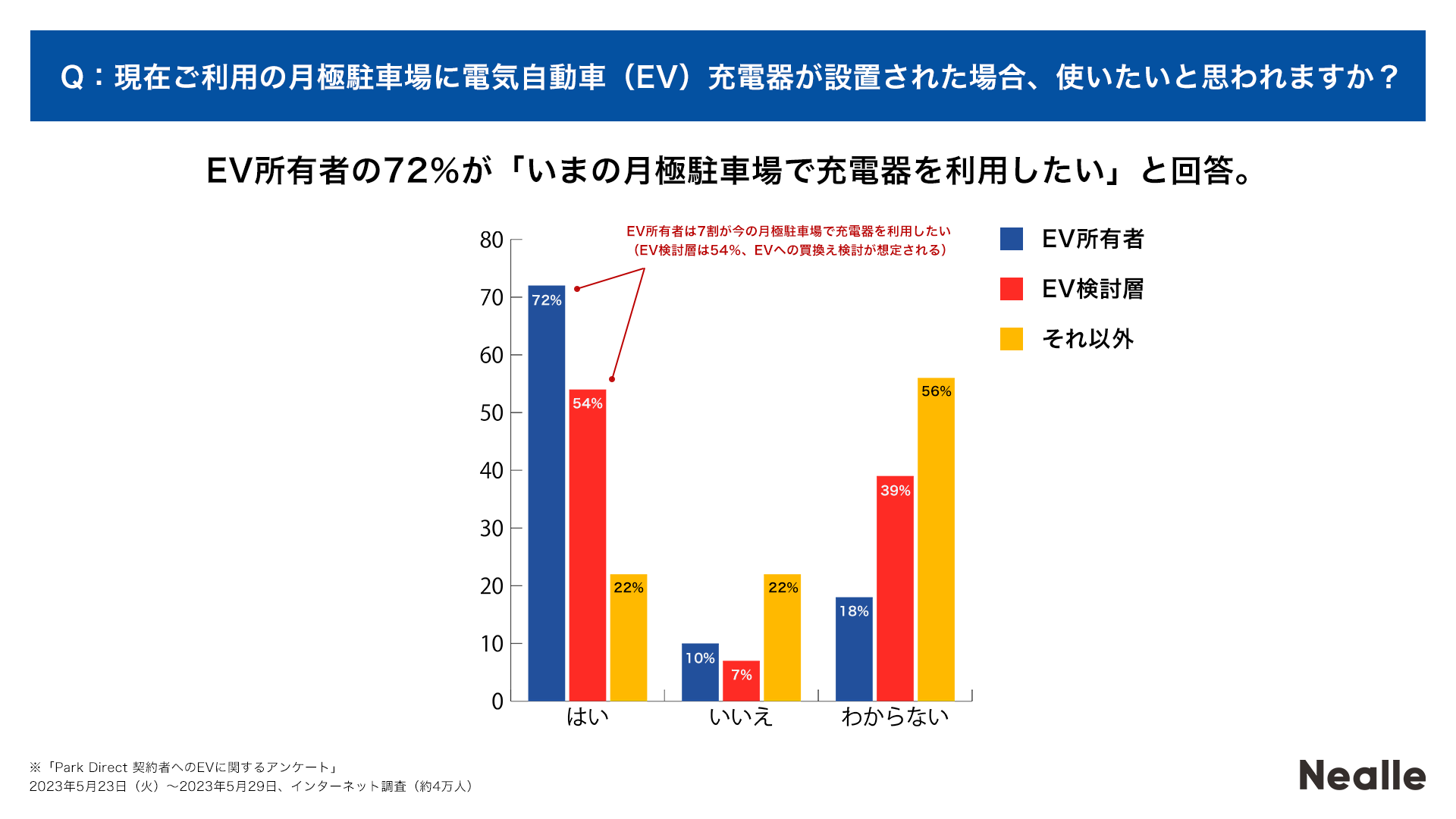 ②EV所有者の72%が「いまの月極駐車場で充電器を利用したい」と回答。