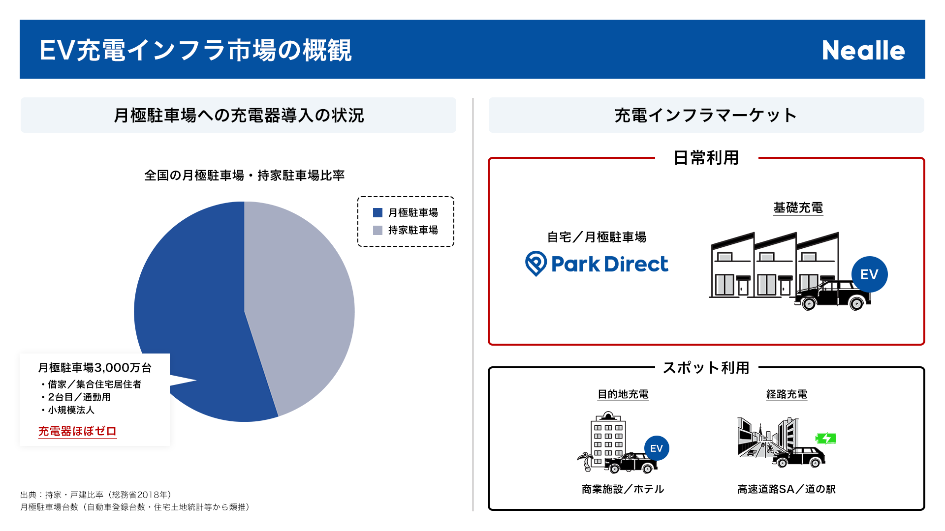 脱炭素社会実現のグローバルな潮流を受け、各国ではガソリン車の販売規制が強まっています。日本政府も2035年までに新車販売の電動車比率を100%とする方針を示していますが、2023年上半期の日本でのEV車の販売割合は2.38%(※2)に過ぎません。EV車の購入を検討している層では「充電時間」や「充電施設の場所・数」が主要な懸念点として挙げられており(※3)、現在、国や地方自治体は、高速道路のサービスエリアや道の駅での「経路充電」、またホテルや商業施設での「目的地充電」への充電インフラの整備を推進しています。しかし、日常的に利用し、長時間停車する場所での「基礎充電」、特に月極駐車場での充電インフラはまだ不足している現状があります。