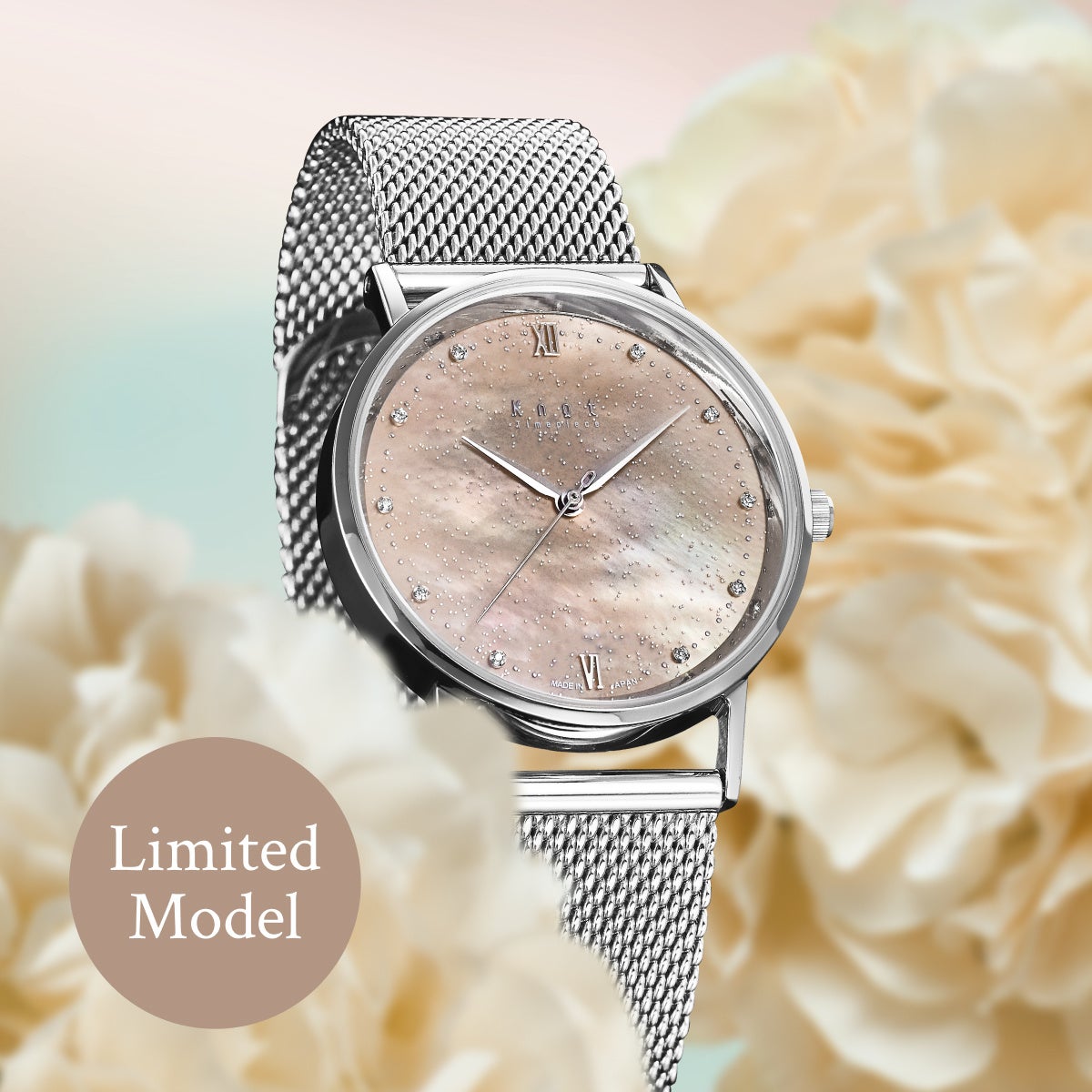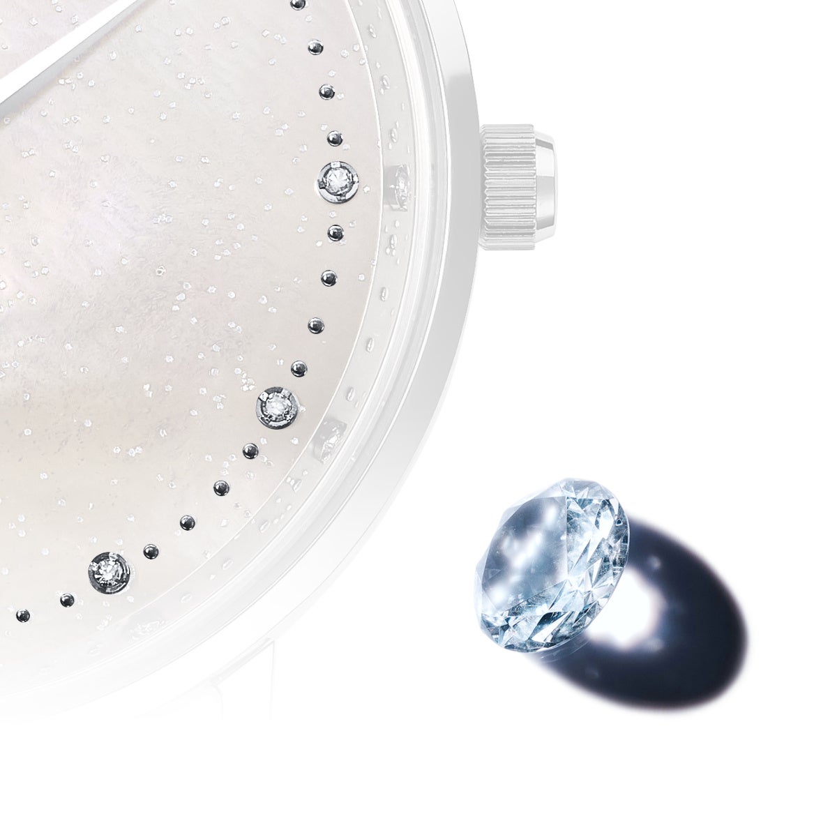 インデックスには、きらめく10個のダイヤモンドをセッティング。さらにダイヤル全体にラメを乗せ、雨粒に濡れる紫陽花を思わせるような情感にあふれる表現を施しました。シャープなドーフィン針も気品に満ち、全体に慎ましくも上質なエレガンスを宿しています。