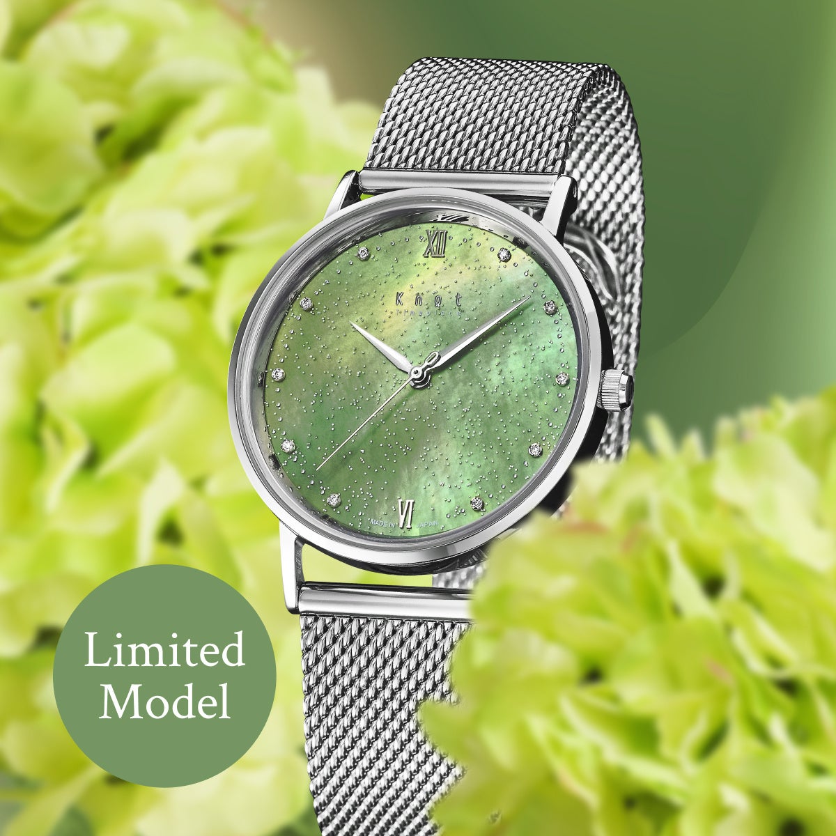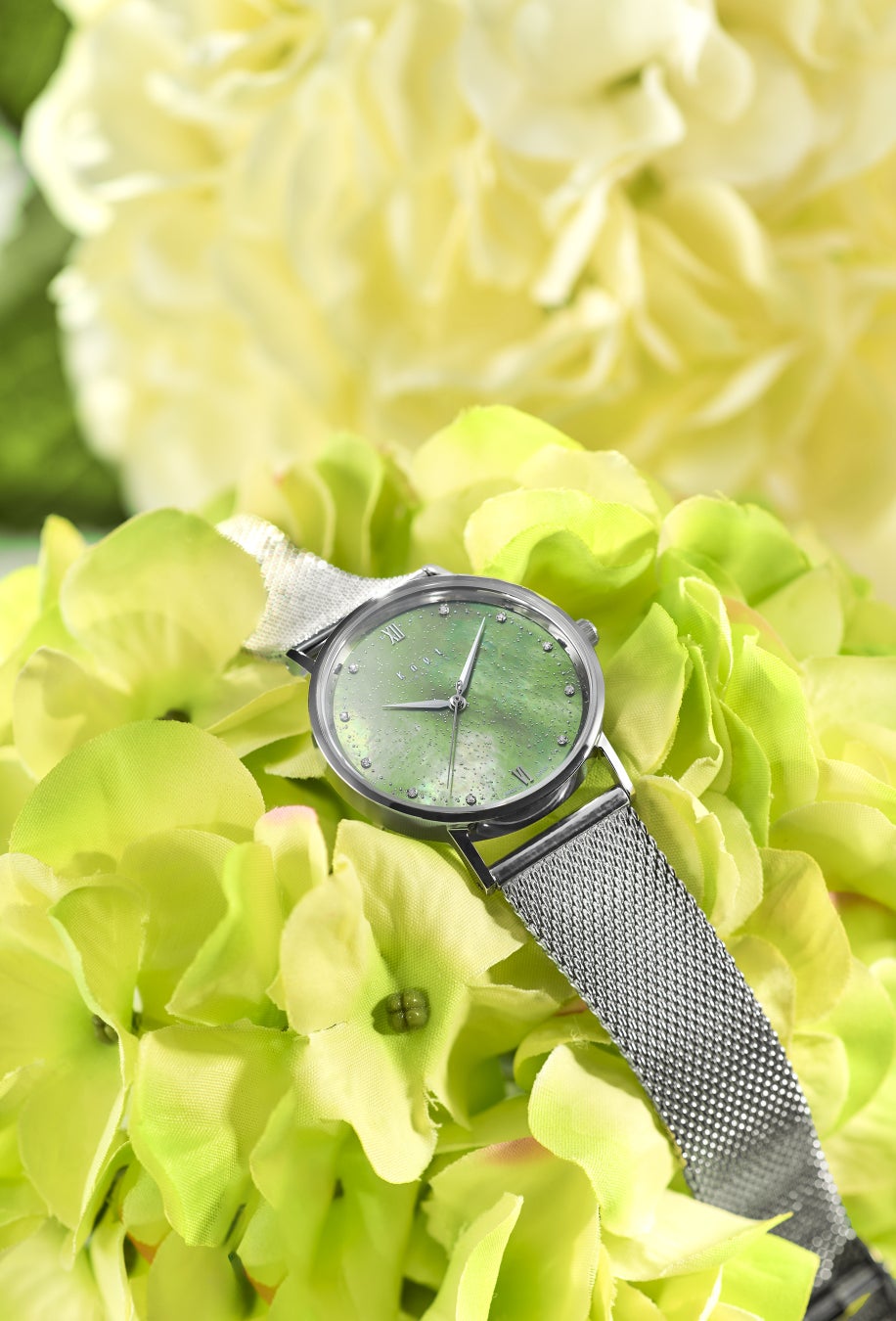紫陽花の色は土壌の酸性度で変わるとともに、日が経つにつれても刻々と変化することから、古来より「移ろい」「はかなさ」「奥ゆかしさ」の美意識を体現する存在でもありました。そうした紫陽花の色彩を表現するため、ダイヤルには光を受けて七色に輝くマザー・オブ・パールを採用。その上で、特有の質感を損ねないようにして塗料を載せることで、見る角度によって色合いが移ろう紫陽花のような存在感を実現しました。紫陽花として一般にイメージしやすいブルー、パープルの他、人気が高まっているグリーン、ベージュも加えた全4色の展開です。