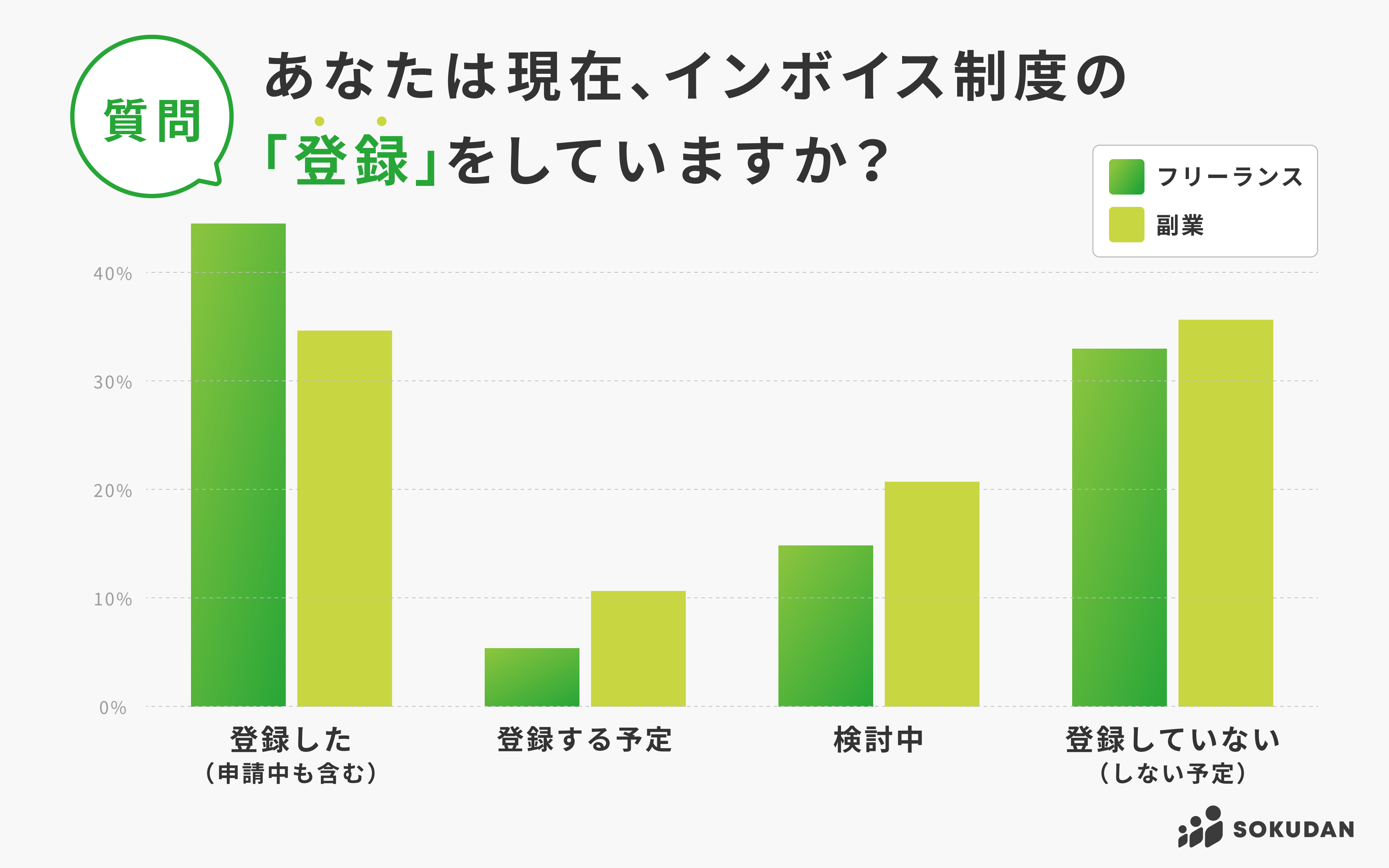 相違点は、「登録した」の回答が、11.9%もフリーランスの方が副業よりも多い点です。フリーランスはインボイス制度の影響が本業に直結するため、この様な結果になったと考えられます。