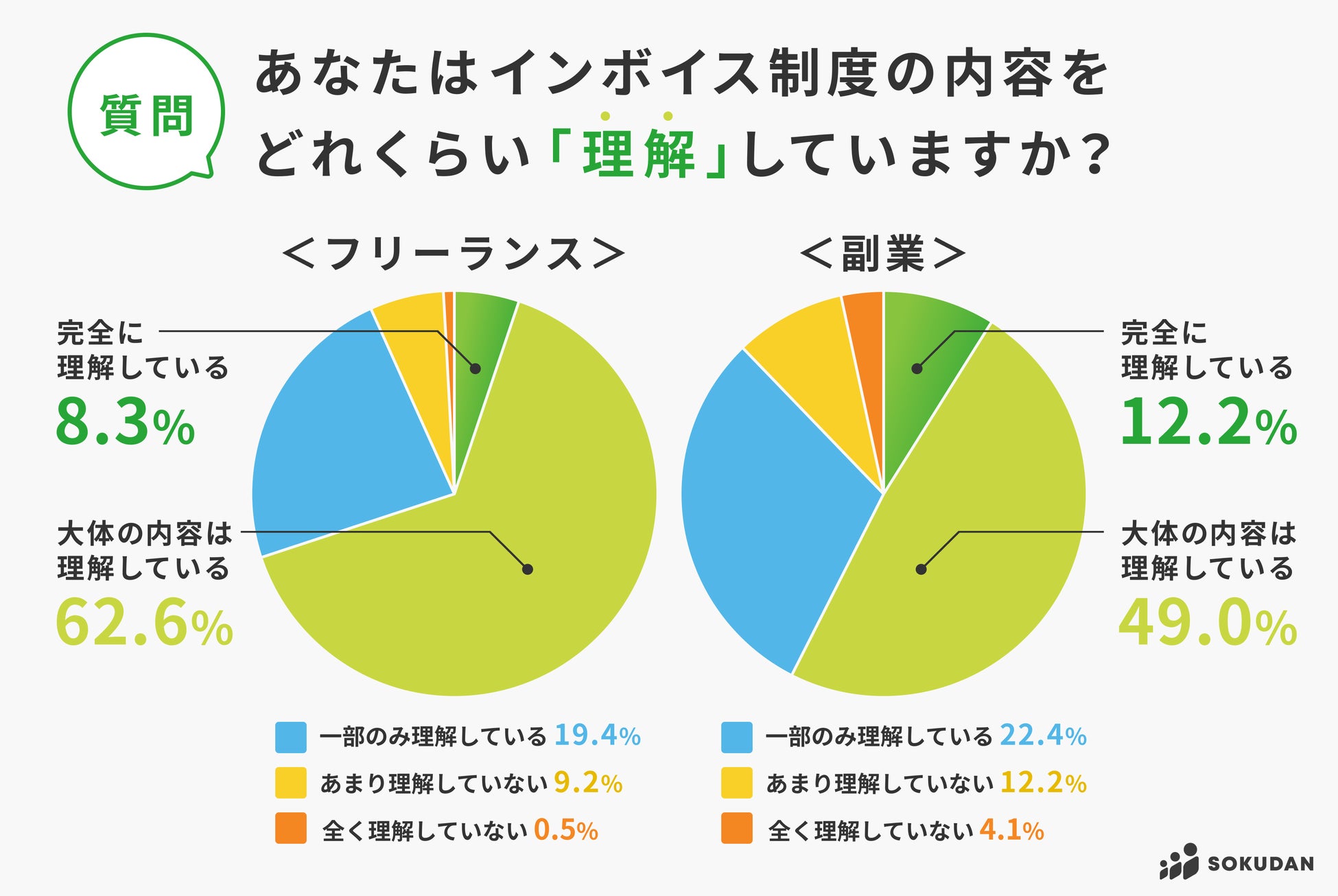 相違点は、「完全に理解している・大体の内容は理解している」を合わせると、フリーランス70.9%に対して、副業は61.2%と約10%の差がある点です。全体的な理解度も、フリーランスの方が高い結果となりました。