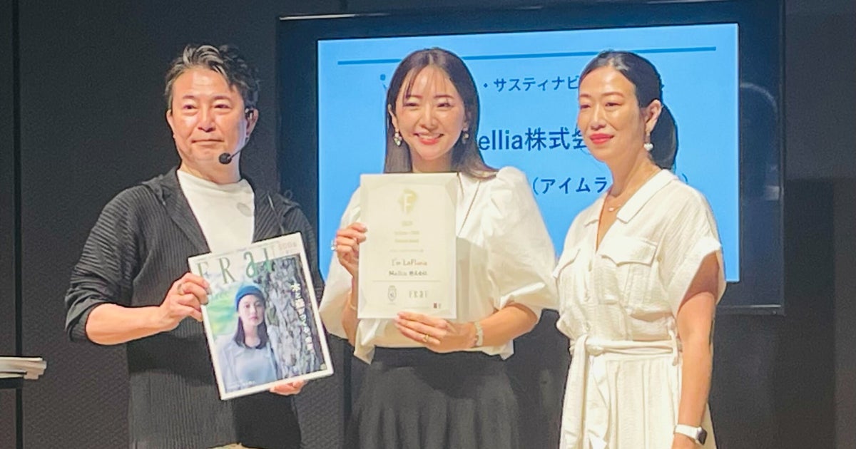 Mellia代表の原由記が授賞式へ出席し、受賞の御礼を述べるとともに、サスティナブルな成分・パッケージにこだわった商品づくりや、アイテムや企業活動を通じすべての女性の活躍を応援することを重視している点などをお伝えしました。
