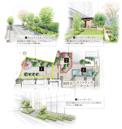 都心近くのレジデンスでありながら、緑の中でくつろぎ、四季の移ろいを楽しめるよう、ゆとりのある敷地内にはヤマザクラをシンボルツリーとした「迎賓の庭」、ベンチやスツールを備えた「ふれあいの庭」、エントランスホールからの眺めをデザインした「景観の庭」の3つの庭園を設けました。白い花を咲かせる木々を中心としたに四季折々の植栽計画により、一年を通して楽しむことができる潤い豊かなランドスケープを描いています。