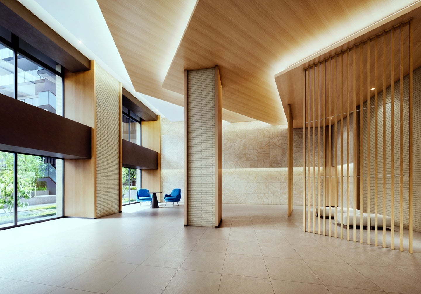 また、エントランスホールは、天井から床まで伸びた木調ルーバーの垂直ラインや、壁に向かって徐々に高まる天井のフォルムが美しいデザインの二層吹抜けの開放的な空間としました。大きなガラスの壁面からは、ビューガーデン(景観の庭)の彩り豊かな絵画のような眺めが広がります。