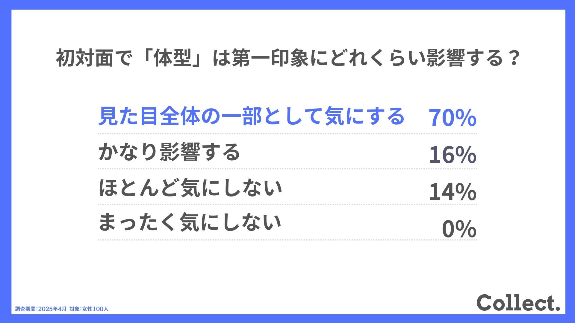 「見た目全体の一部として気にする」が70%。体型はあくまで一要素ではあるものの、第一印象には一定の影響を与えているようです。