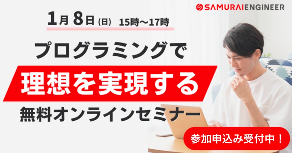プログラミングスクール「SAMURAI ENGINEER」を運営する株式会社SAMURAI(本社所在地:東京都千代田区、代表取締役 :高比良 直人)は、無料オンラインセミナー「プログラミングで理想の人生を実現するための4STEP」を1月8日(日)15時より開催いたします。