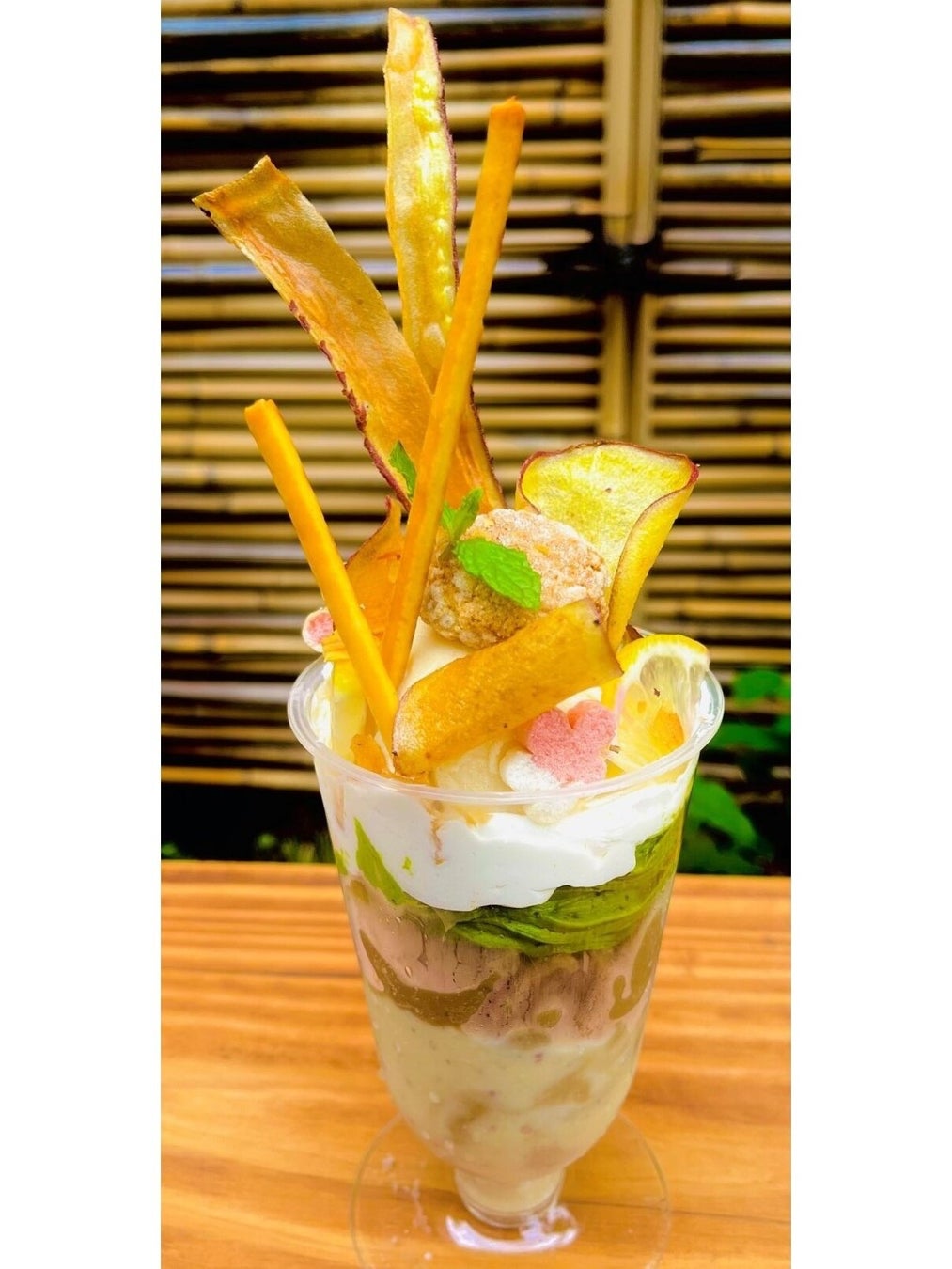 焼き芋をこれでもかと盛った芋ぺちーの。芋感という言葉以外出てこない濃厚な芋ぺちーのは須藤牧場のアイスクリームを使い爽やかさと濃厚さのバランスを追求した贅沢な逸品です。