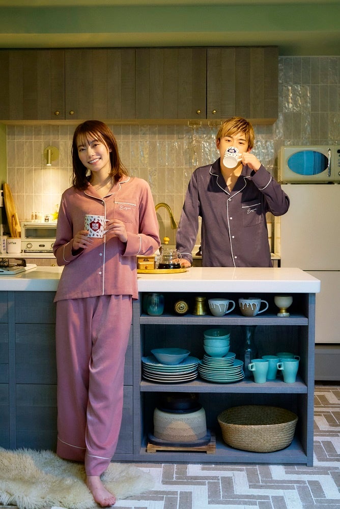 ビジュアルでは、端正なルックスの2人がクールに魅せる瞬間と、自然体のナチュラルな世界観、仲の良さが溢れ出るカップルならではのキュンっとする瞬間など、たくさんの表情を魅せる。撮影現場では、キッチンでの世界観のあるシーンの撮影写真に「オシャレ!すごい!海外の映画みたい!」と、こーくんも大ハシャギ!なごみちゃんがパジャマを整えてあげる優しい対応も印象的な現場となった。