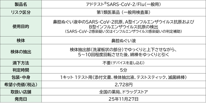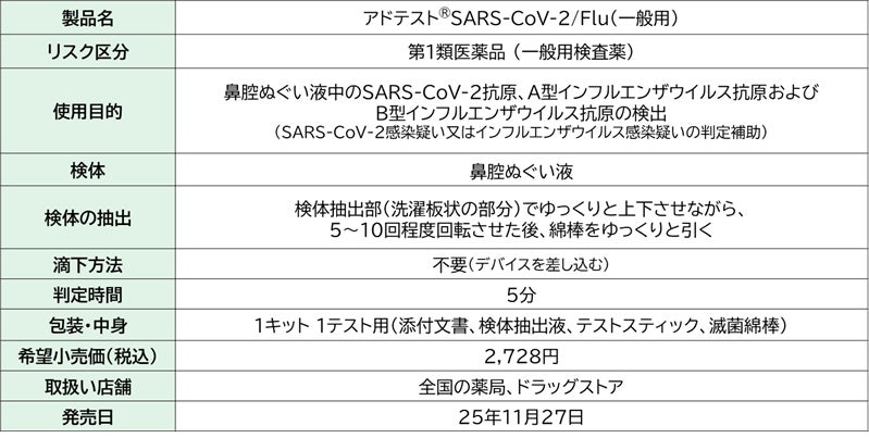 ヘルスケア価値の提供を通じて社会に貢献するシオノギヘルスケア株式会社(本社:大阪府大阪市、代表取締役社長:中川 ゆう子、以下、シオノギヘルスケア)は、この度、新型コロナウイルス、インフルエンザ(A型・B型)感染症の一般用抗原検査キット(OTC)「アドテスト®SARS-CoV-2/Flu(一般用)」(以下、本キット)を11月27日より発売いたします。