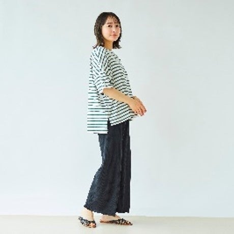 ウェスト部分に施されたゴムとワイドなシルエットで着心地の良さと追求しつつも、きちんと感のある素材やシンプルな色味でシーンを選ばず使いやすい一着に仕立てました。