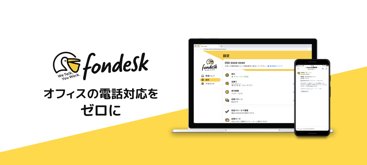 「fondesk」は、オフィスにかかってくる電話の対応を代行し、受けた電話内容をチャット(Slack・Chatwork・Microsoft Teams・LINE・LINE WORKS・Google Chat)やメールで報告するサービスです。2019年2月18日のサービス開始以来、「電話対応をなくしてコア業務に集中できる職場にしたい」「受電漏れを防ぎたい」といった企業からご好評をいただいております。