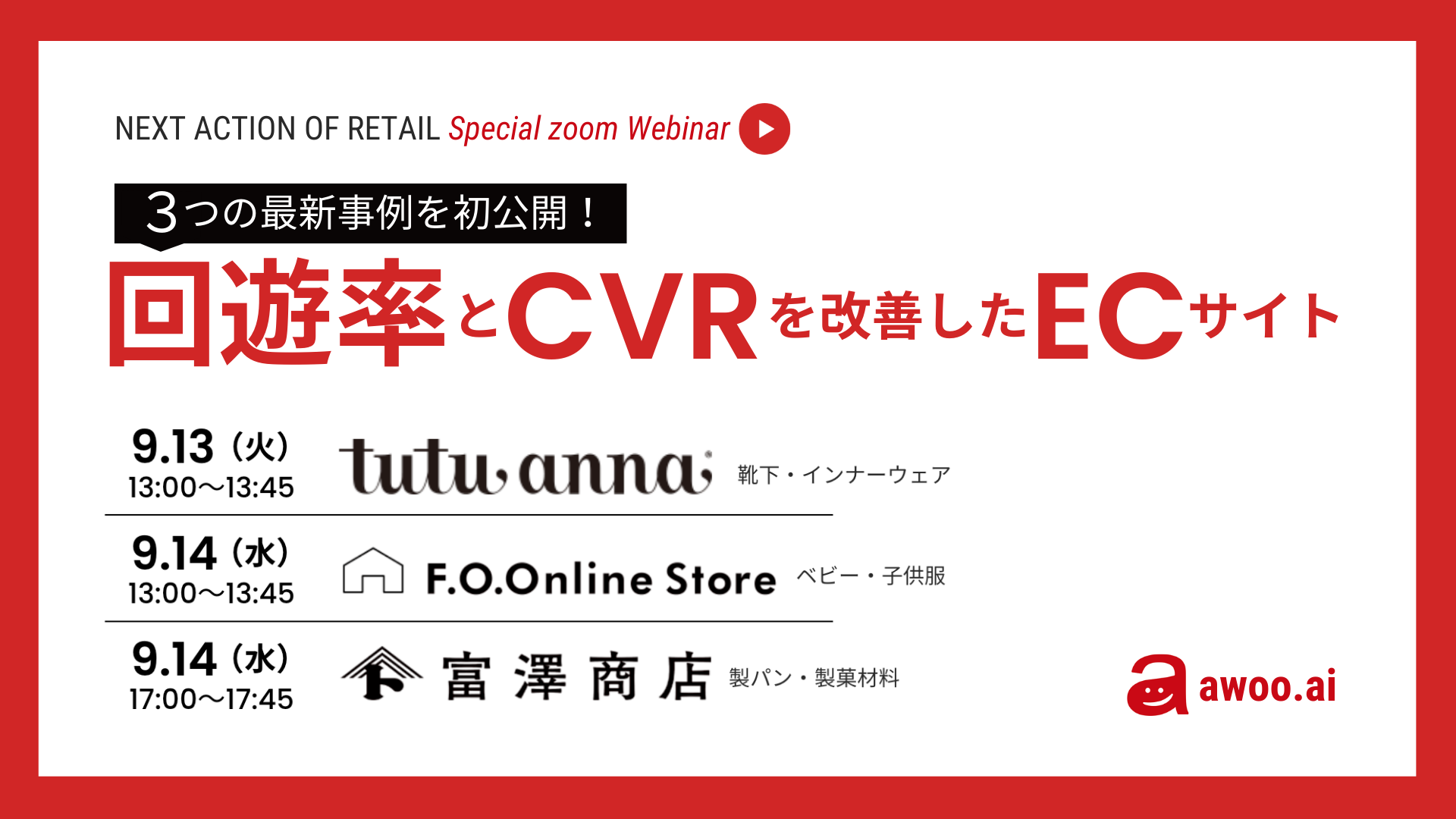 今回活用事例を発表した「チュチュアンナ」「F・O・インターナショナル」「富澤商店」の3社がウェビナーに登壇します。どのセッションも事業課題、具体的解決策、改善された数字効果をそれぞれのEC担当者との対談形式でお伝えします。