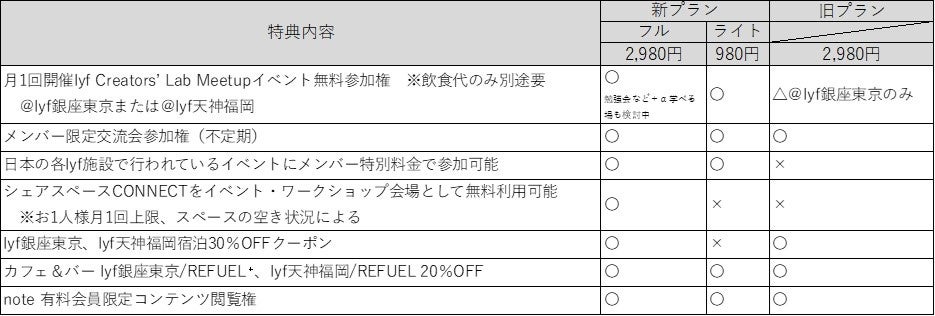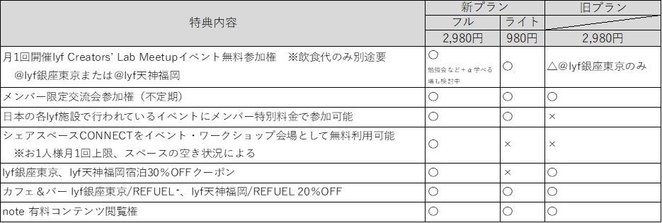 新プランとなる月額 2,980 円のフルプランでは、lyf銀座東京、lyf天神福岡の 2 拠点の共用部であるCONNECTスペースにて、メンバー自身が実施したいと思う内容のイベントをおひとり様最大月1回無料で開催できる特典*やより実践的な活動内容を追加、月額980円のライトプランは、より興味がある方が一歩踏み出し参加しやすいよう、設定いたしました。