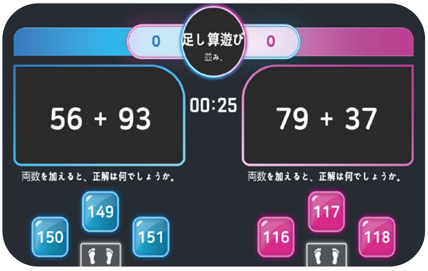 ・活用デジタルデバイス:床投影型の体育DXデバイス「フロアピック」を使った椅子に座りながら、足を使って操作するデジタルプレイ環境