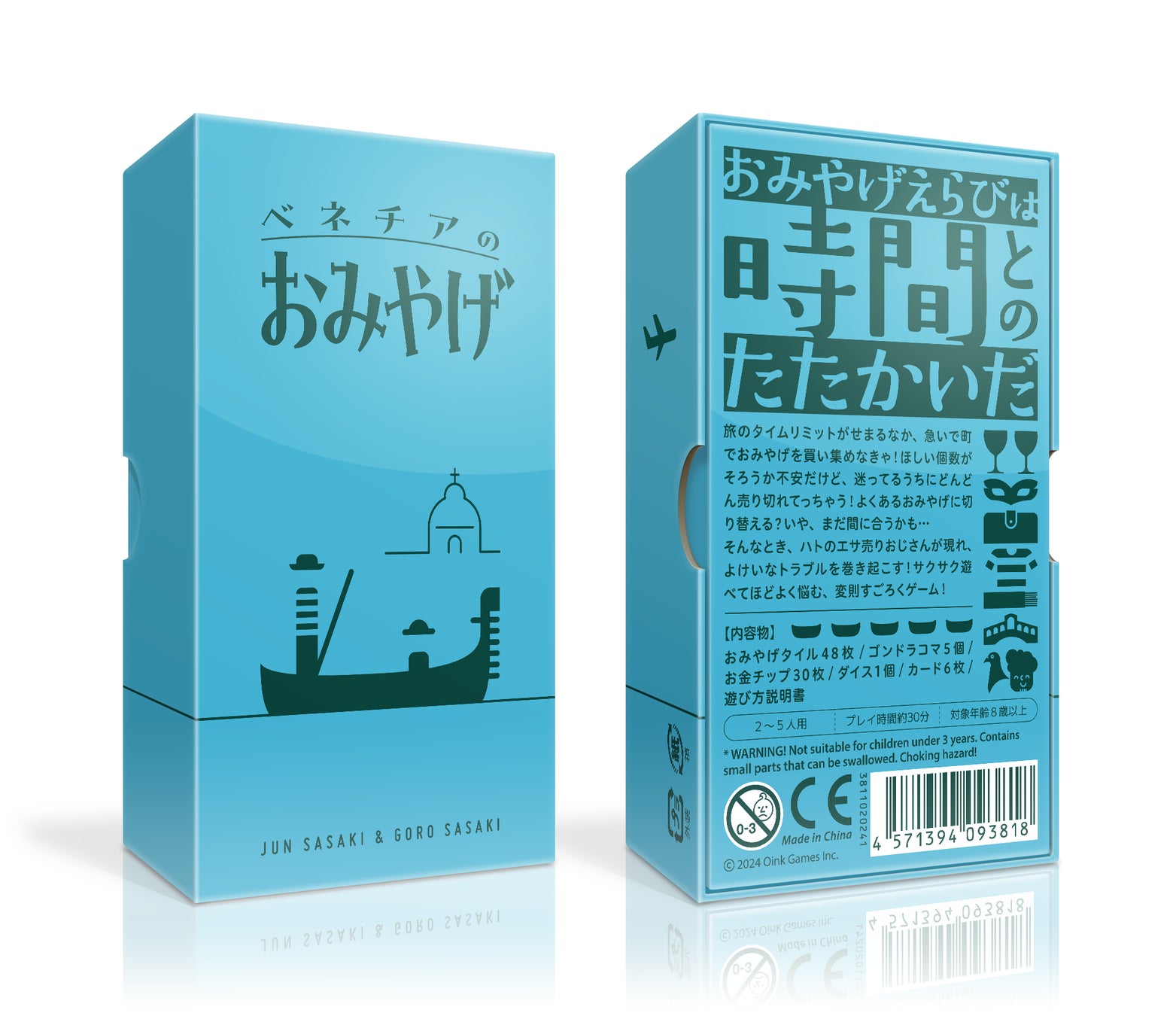 株式会社オインクゲームズは、2024年秋、新作ボードゲーム『ベネチアのおみやげ』を発売します。ドイツの展示会SPIEL’24(10月3日〜6日)にて発表し、日本ではゲームマーケット2024秋(11月16日・17日)にて、北米ではPAX Unplugged’24(12月6日〜8日)にて発売予定です。30万部発行の『海底探険』デザイナーコンビ、佐々木隼・佐々木吾朗による、10年ぶりの最新作となります。