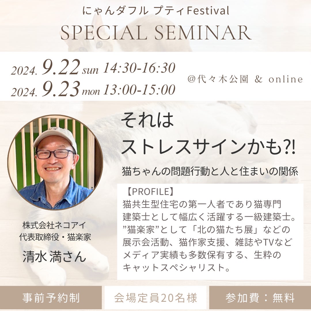 ☆9月の連休は代々木公園で猫イベントに☆業界の第一人者による猫ちゃんの健康や未来を考える無料セミナー開催決定!