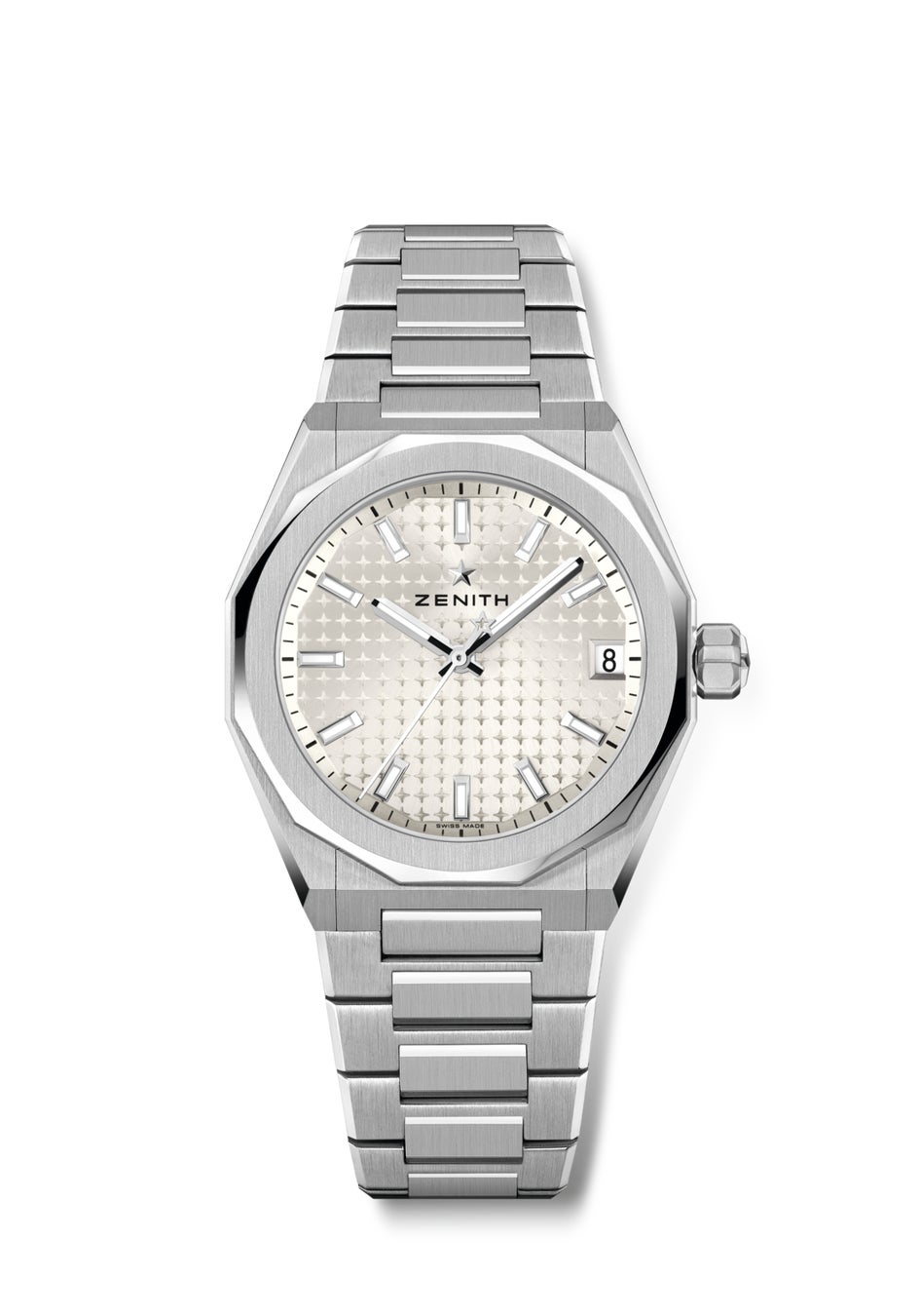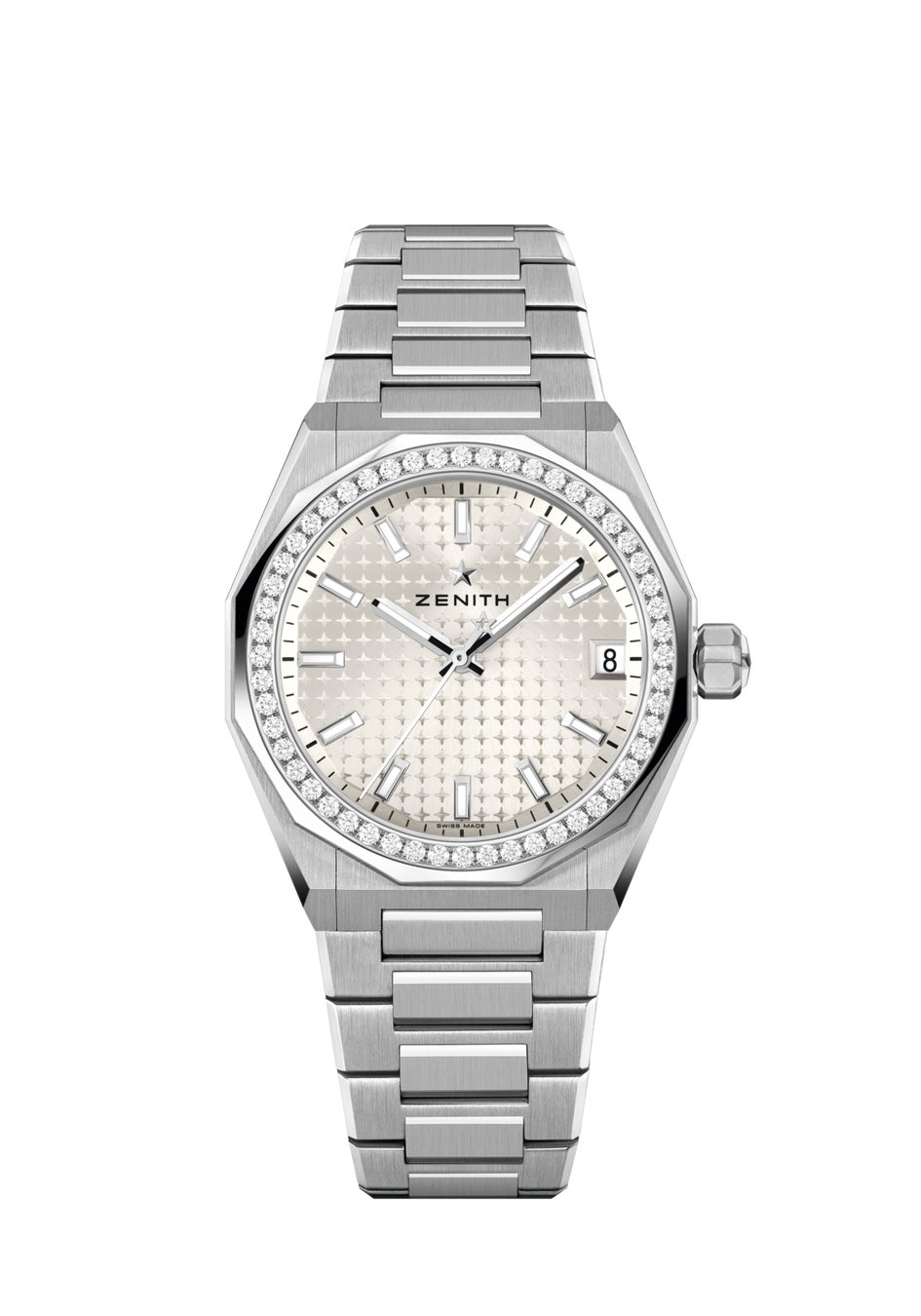 2022年に誕生した「デファイ スカイライン」は、1960年代後半のデファイの先駆的なデザインコードから着想を得て、ダイナミックで建築的なスピリットを体現しています。現代のライフスタイルに共鳴するこのコレクションは、早くもゼニスのポートフォリオの柱のひとつとなり、さまざまなサイズ、素材、デザインを取り入れた多彩なコレクションへと進化を遂げました。その系譜に連なる新作が、洗練されたシルバートーン文字盤を備えた36mmモデルです。なめらかでミニマルなモデルと、ブリリアントカット ダイヤモンドをセットしたまばゆいモデルという、個性豊かな2つのスタイルで登場します。