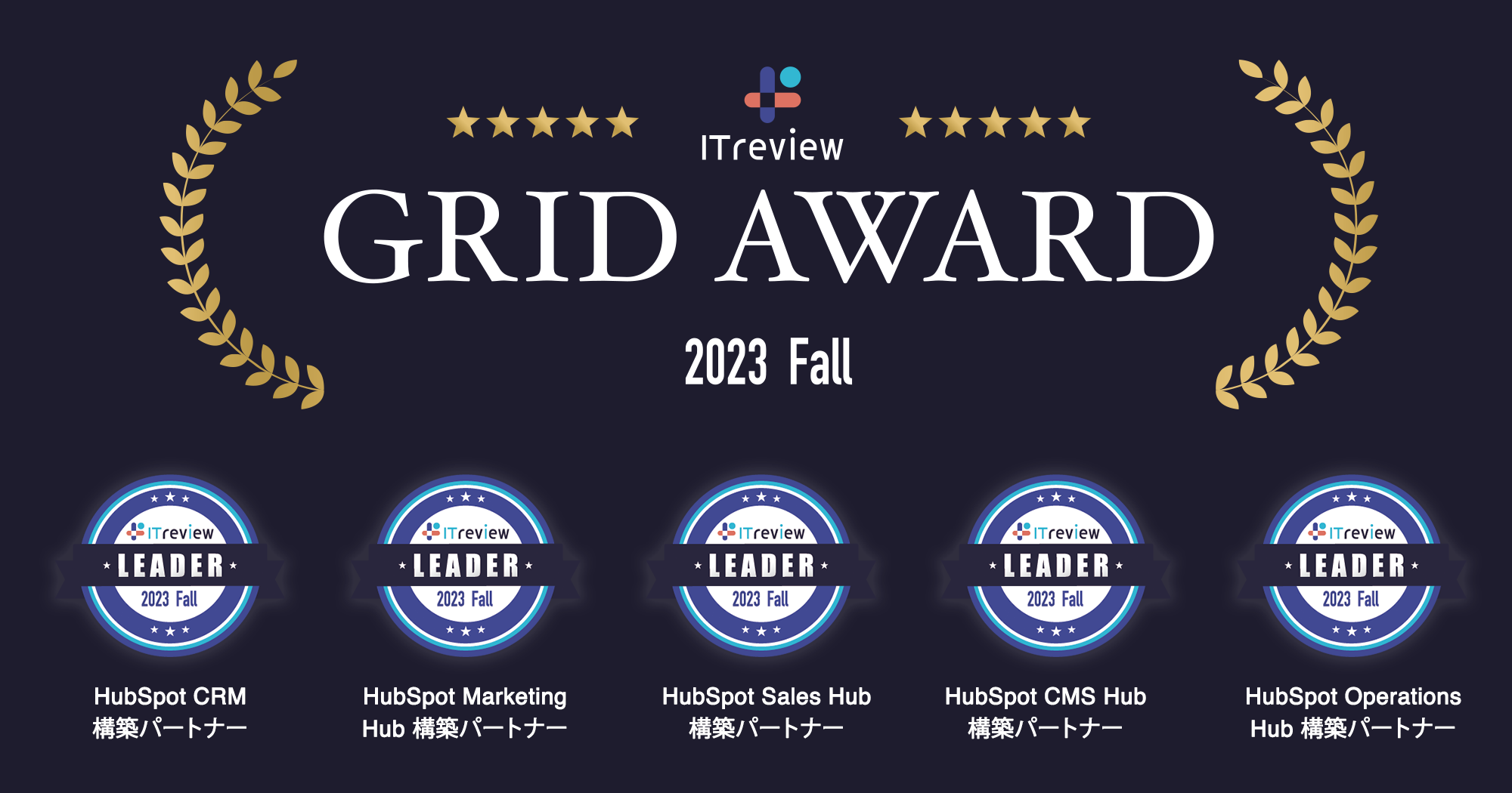 今回の「ITreview Grid Award 2023 Fall」で、「HubSpot構築パートナー」内の5部門(「HubSpot CRM構築パートナー」「HubSpot Marketing Hub構築パートナー」「HubSpot Sales Hub構築パートナー」「HubSpot CMS Hub構築パートナー」「HubSpot Operations Hub構築パートナー」)の「Leader」受賞は5期連続となりました。