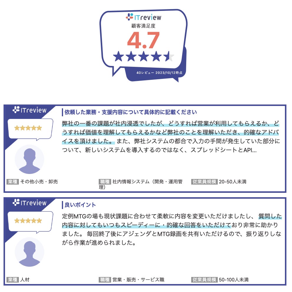 HubSpotの導入支援におきまして、お客様のビジネスを理解し各社に適した利用方法の提案をすることで、「適格なアドバイスを頂けた」「想定よりも早く導入が実現した」「Slackのサポートの応答が迅速だった」など、お客様満足度の高いレビューを頂戴いたしました。