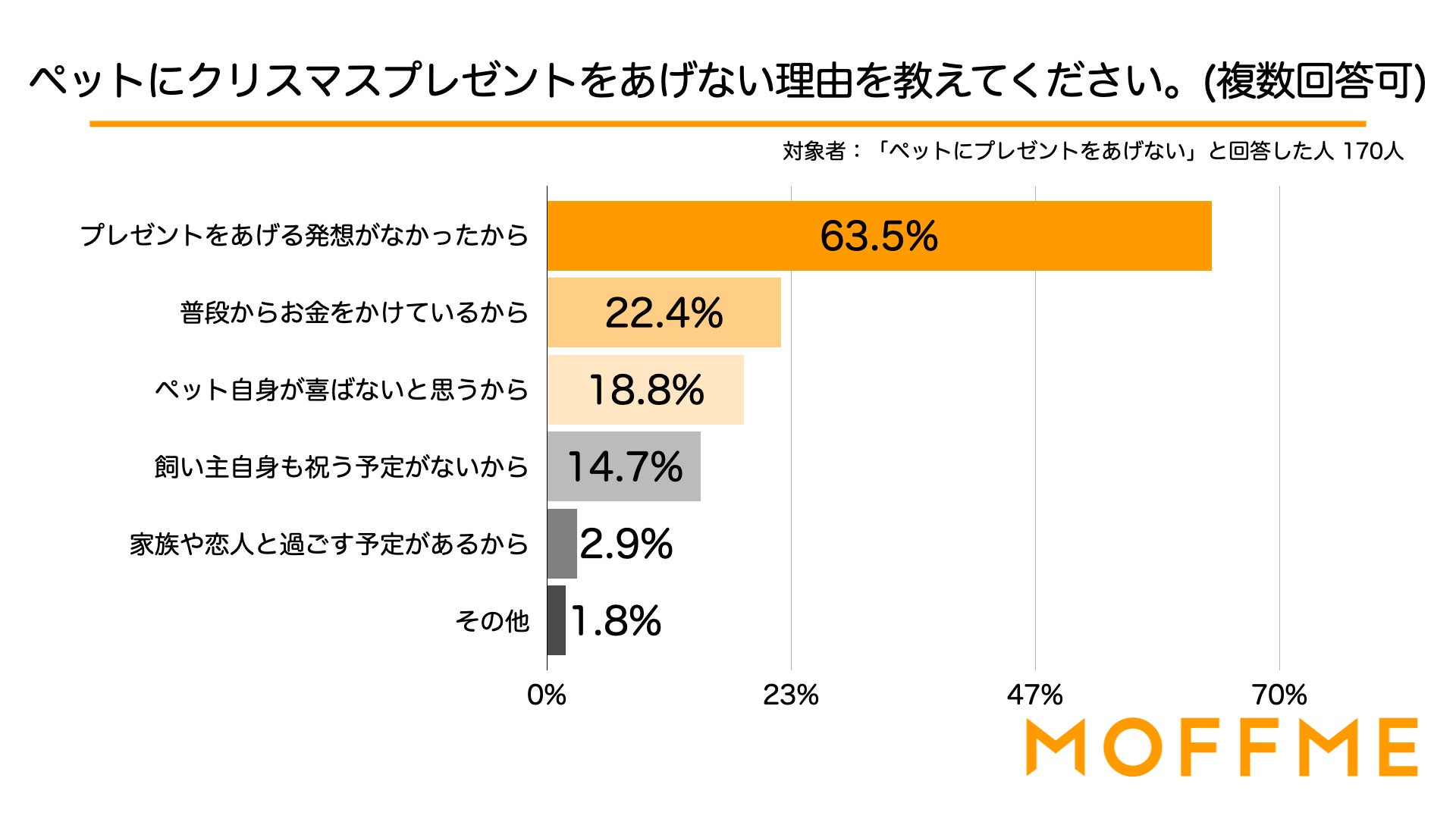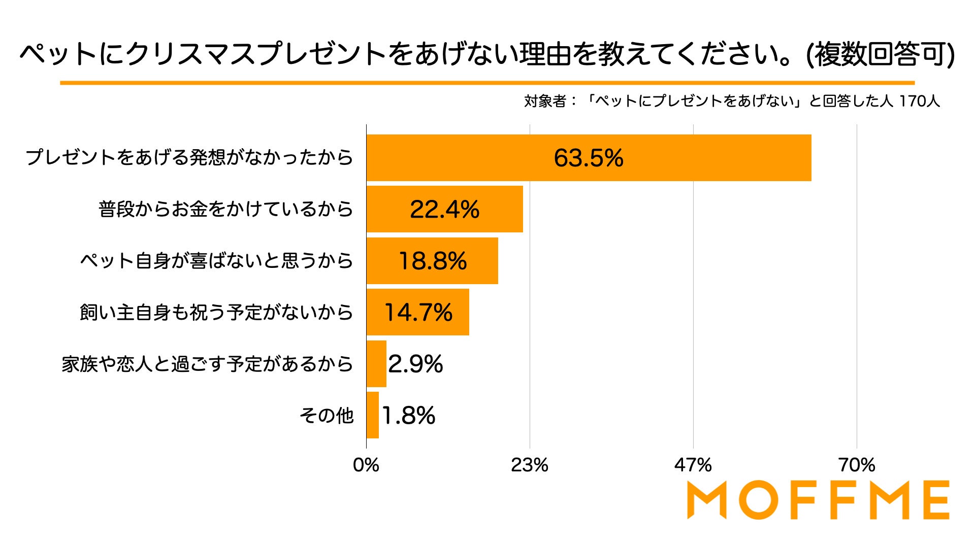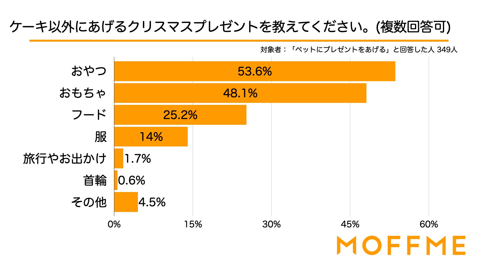 「ペットにクリスマスプレゼントはあげますか?」という質問に対して、クリスマスプレゼントをあげると回答した人はなんと67.2%と、約7割の人がペットのためにクリスマスプレゼントを用意していることがわかりました。