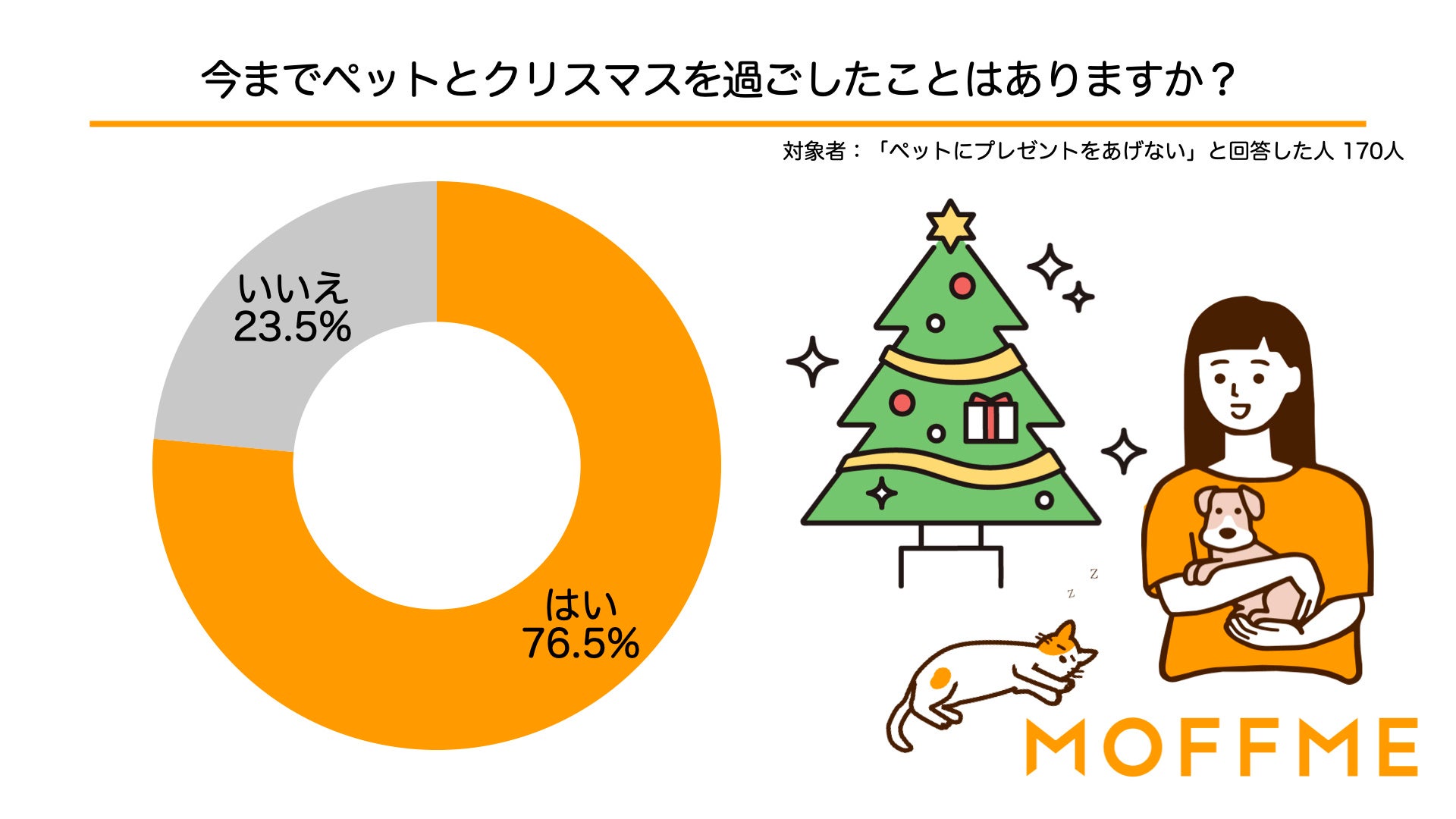 去年までの段階で、ペットとクリスマスを過ごしたことがあると回答した方は、85.9%、今年が初めてと回答した方は、11.5%となっており、ペットも家族の一員として一緒にクリスマスを過ごすご家庭が多いという結果でした。